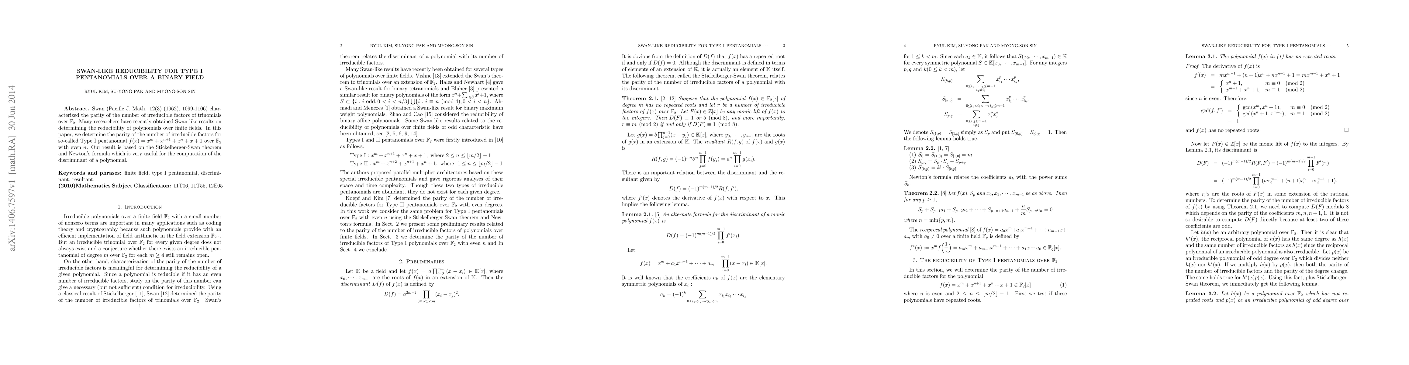 Swan (Pacific J. Math. 12(3) (1962), 1099-1106) characterized the parity of the number of irreducible factors of trinomials over $F_2$. Many researchers have recently obtained Swan-like results on determining the reducibility of polynomials over finite fields. In this paper, we determine the parity of the number of irreducible factors for so-called Type I pentanomial $f(x)=x^m+x^{n+1}+x^n+x+1$ over $F_2$ with even $n$. Our result is based on the Stickelberger-Swan theorem and Newton's formula which is very useful for the computation of the discriminant of a polynomial.