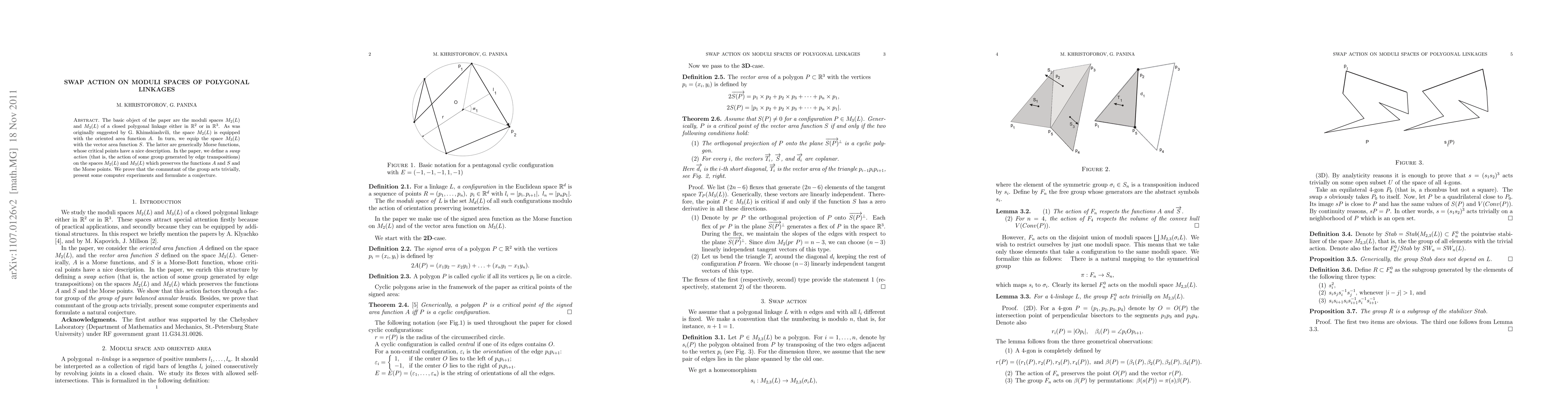 The basic object of the paper is the moduli space $M_{2,3}(L)$ of a closed polygonal linkage either in $\mathbb{R}^2$ or in $\mathbb{R}^3$. As was originally suggested by G. Khimshiashvili, the space $M_{2}(L)$ is equipped with the oriented area function $A$, whereas (as is suggested in the paper) $M_{3}(L)$ is equipped with the vector area function $S$. The latter are generically Morse functions, whose critical points have a nice description. In the preprint, we define a \textit{swap action} (that is, the action of some group generated by edge transpositions) on the space $M_{2,3}(L)$ which preserves the functions $A$ and $S$ and the Morse points. We prove that the commutant of the group acts trivially, present some computer experiments and formulate a conjecture.