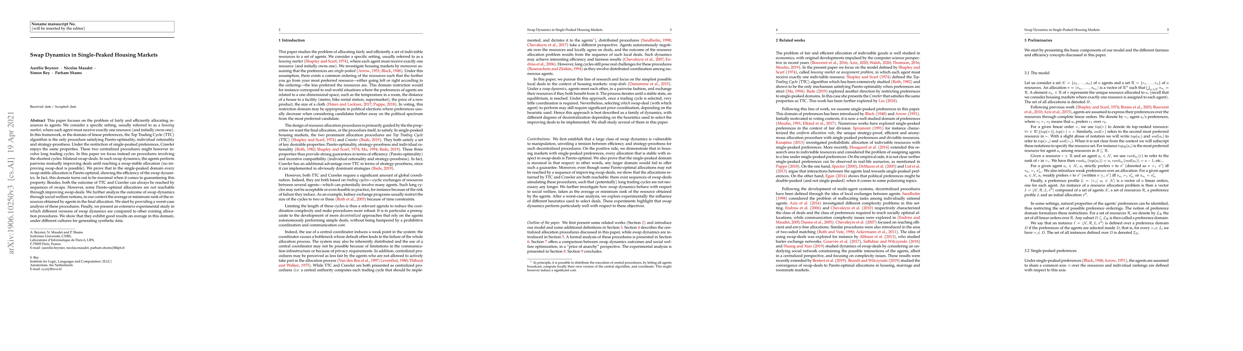 This paper investigates the efficiency and fairness of bilateral swap-deals in single-peaked housing markets, proving that every swap-stable allocation is Pareto-optimal. It also demonstrates that while the Top Trading Cycle and Crawler algorithms can be reached via swaps, not all Pareto-optimal allocations are reachable through swap dynamics, and presents an experimental study comparing swap dynamics to other allocation procedures.