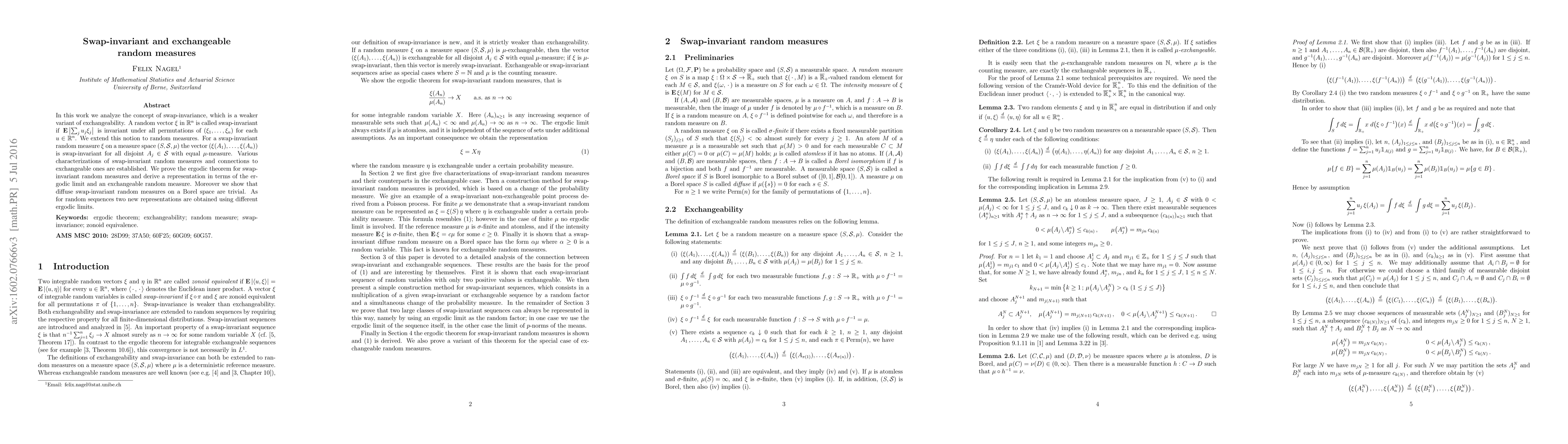 The paper introduces and develops the theory of swap-invariant random measures, providing characterizations, an ergodic theorem, and representations in terms of exchangeable measures.