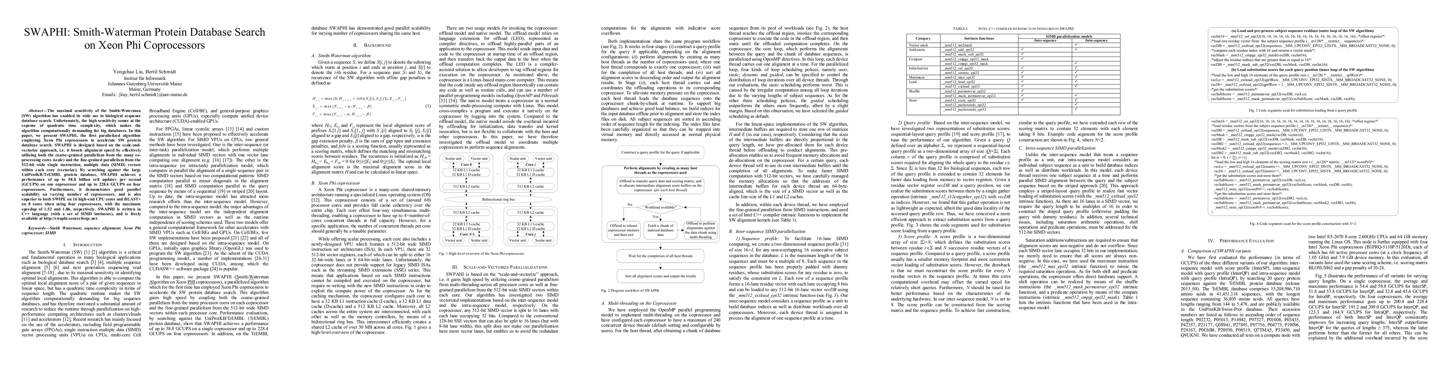 SWAPHI is a parallelized algorithm for accelerating Smith-Waterman protein database searches using Xeon Phi coprocessors, achieving up to 228.4 GCUPS on four coprocessors and demonstrating superior performance compared to SWIPE and BLAST+. It leverages both coarse-grained and fine-grained parallelism.