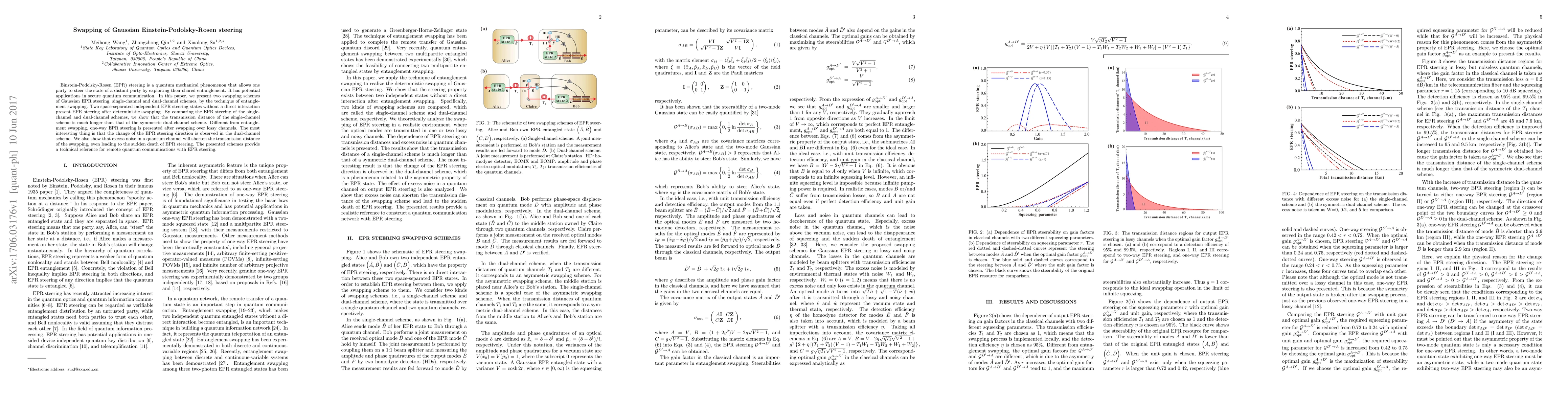 This paper introduces two Gaussian Einstein-Podolsky-Rosen (EPR) steering swapping schemes—single-channel and dual-channel—demonstrating that EPR steering can be extended over long distances without direct interaction through entanglement swapping. The single-channel scheme achieves a significantly longer transmission distance compared to the dual-channel scheme, while the latter exhibits a unique change in EPR steering direction.