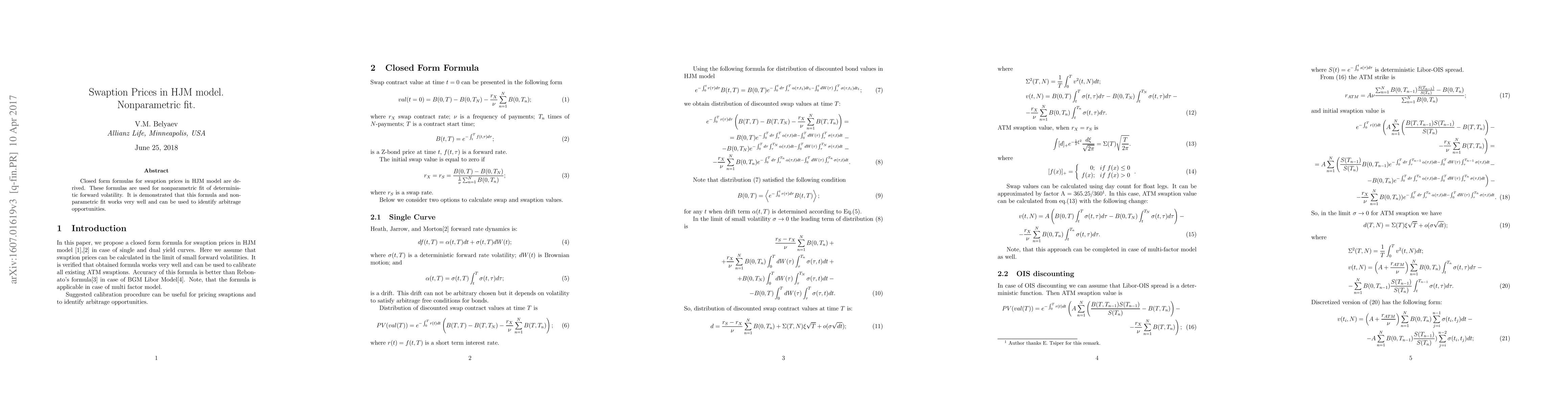 Summary: This paper derives closed-form formulas for swaption prices within the HJM model and applies them to a nonparametric fit of deterministic forward volatility, showing effective identification of arbitrage opportunities.