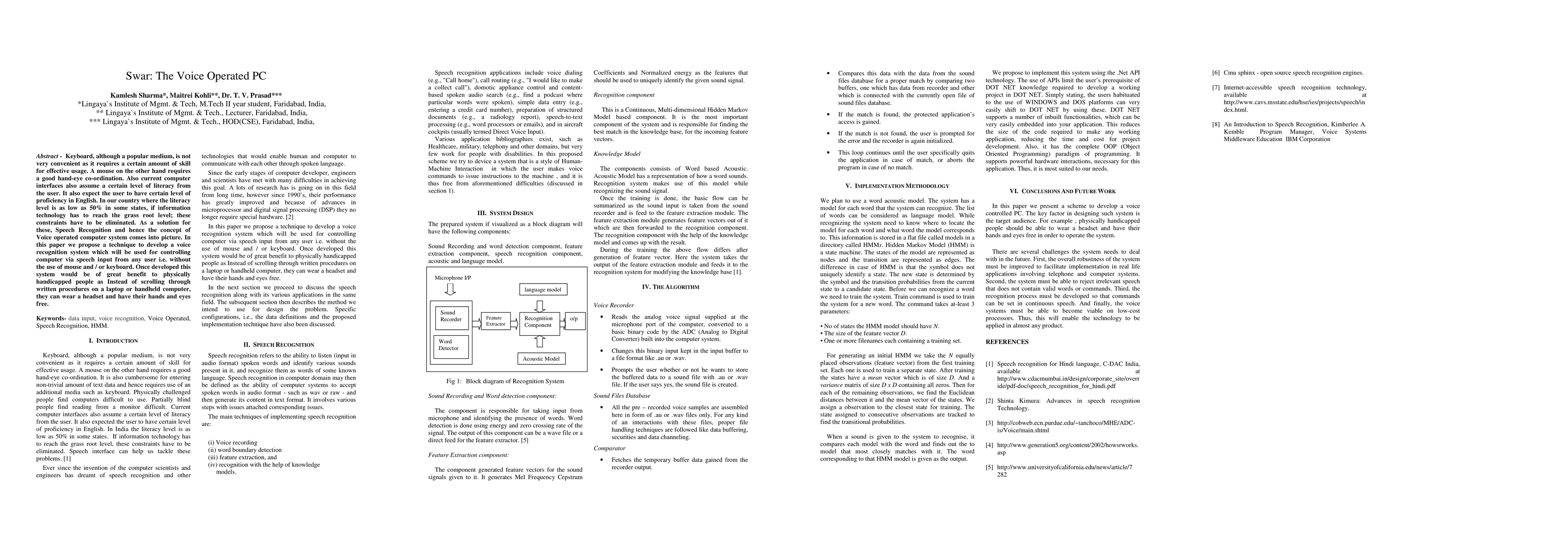 Keyboard, although a popular medium, is not very convenient as it requires a certain amount of skill for effective usage. A mouse on the other hand requires a good hand-eye co-ordination. Also current computer interfaces also assume a certain level of literacy from the user. It also expect the user to have certain level of proficiency in English. In our country where the literacy level is as low as 50% in some states, if information technology has to reach the grass root level; these constraints have to be eliminated. As a solution for these, Speech Recognition and hence the concept of Voice operated computer system comes into picture. In this paper we propose a technique to develop a voice recognition system which will be used for controlling computer via speech input from any user i.e. without the use of mouse and / or keyboard. Once developed this system would be of great benefit to physically handicapped people as Instead of scrolling through written procedures on a laptop or handheld computer, they can wear a headset and have their hands and eyes free.