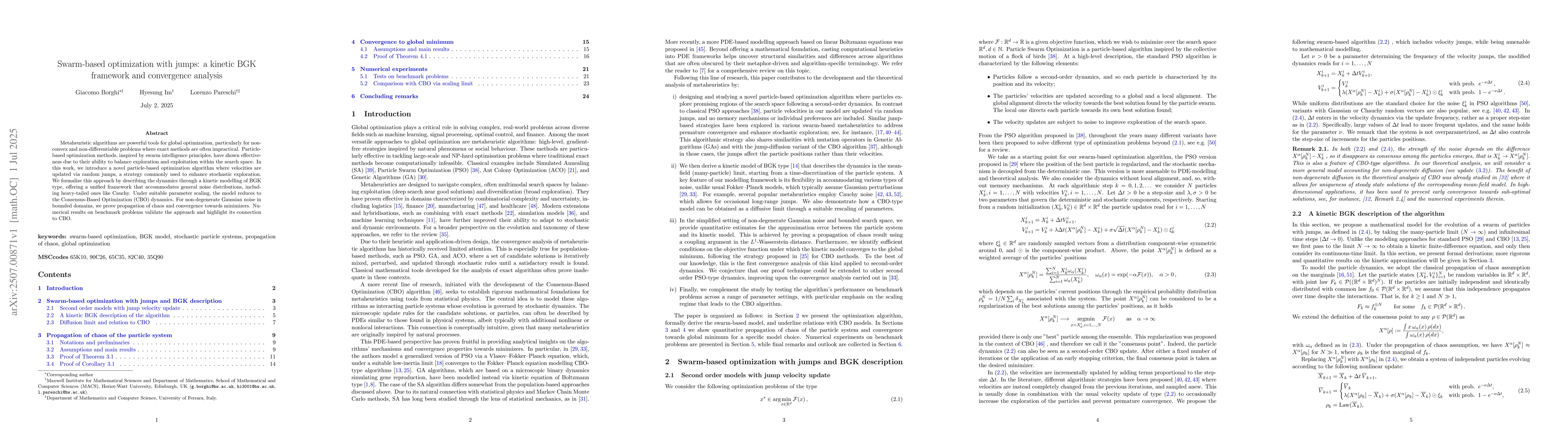 Metaheuristic algorithms are powerful tools for global optimization, particularly for non-convex and non-differentiable problems where exact methods are often impractical. Particle-based optimization methods, inspired by swarm intelligence principles, have shown effectiveness due to their ability to balance exploration and exploitation within the search space. In this work, we introduce a novel particle-based optimization algorithm where velocities are updated via random jumps, a strategy commonly used to enhance stochastic exploration. We formalize this approach by describing the dynamics through a kinetic modelling of BGK type, offering a unified framework that accommodates general noise distributions, including heavy-tailed ones like Cauchy. Under suitable parameter scaling, the model reduces to the Consensus-Based Optimization (CBO) dynamics. For non-degenerate Gaussian noise in bounded domains, we prove propagation of chaos and convergence towards minimizers. Numerical results on benchmark problems validate the approach and highlight its connection to CBO.
