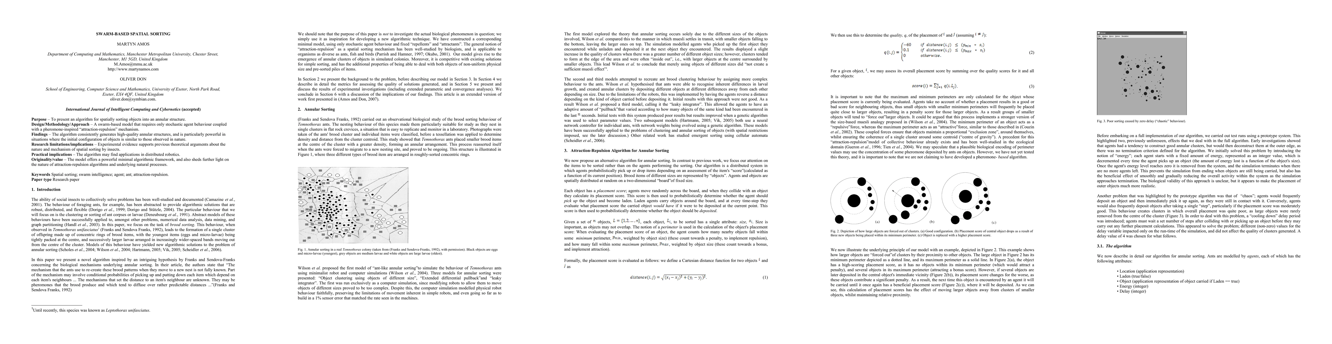 Purpose: To present an algorithm for spatially sorting objects into an annular structure. Design/Methodology/Approach: A swarm-based model that requires only stochastic agent behaviour coupled with a pheromone-inspired "attraction-repulsion" mechanism. Findings: The algorithm consistently generates high-quality annular structures, and is particularly powerful in situations where the initial configuration of objects is similar to those observed in nature. Research limitations/implications: Experimental evidence supports previous theoretical arguments about the nature and mechanism of spatial sorting by insects. Practical implications: The algorithm may find applications in distributed robotics. Originality/value: The model offers a powerful minimal algorithmic framework, and also sheds further light on the nature of attraction-repulsion algorithms and underlying natural processes.