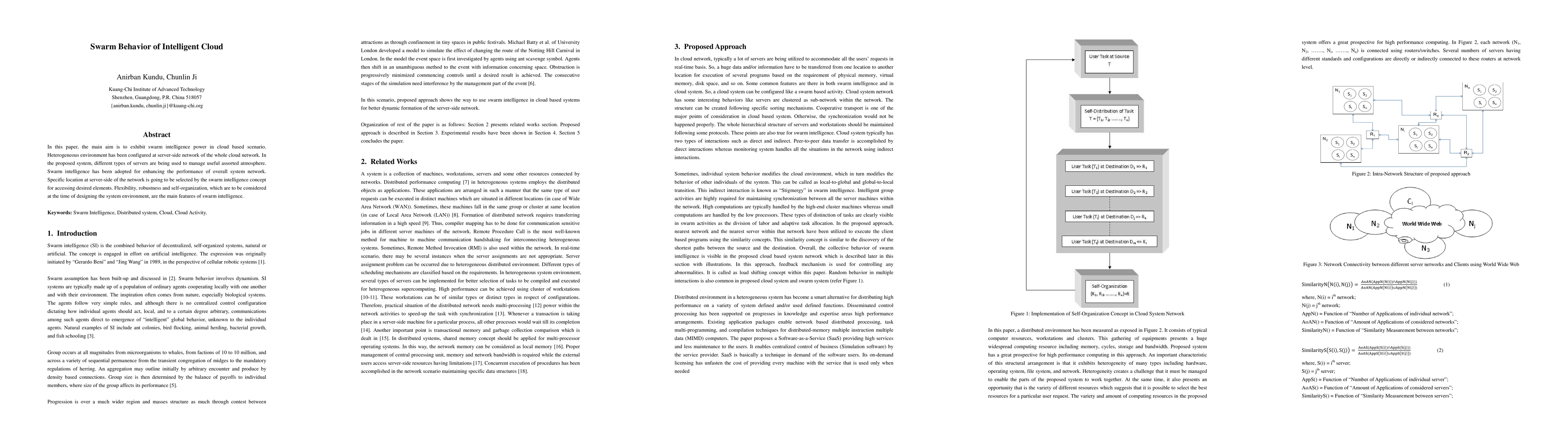 In this paper, the main aim is to exhibit swarm intelligence power in cloud based scenario. Heterogeneous environment has been configured at server-side network of the whole cloud network. In the proposed system, different types of servers are being used to manage useful assorted atmosphere. Swarm intelligence has been adopted for enhancing the performance of overall system network. Specific location at server-side of the network is going to be selected by the swarm intelligence concept for accessing desired elements. Flexibility, robustness and self-organization, which are to be considered at the time of designing the system environment, are the main features of swarm intelligence.