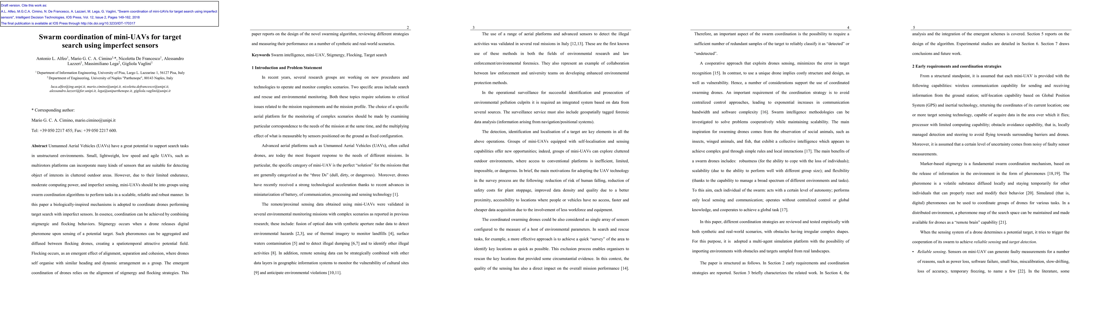 Unmanned Aerial Vehicles (UAVs) have a great potential to support search tasks in unstructured environments. Small, lightweight, low speed and agile UAVs, such as multi-rotors platforms can incorporate many kinds of sensors that are suitable for detecting object of interests in cluttered outdoor areas. However, due to their limited endurance, moderate computing power, and imperfect sensing, mini-UAVs should be into groups using swarm coordination algorithms to perform tasks in a scalable, reliable and robust manner. In this paper a biologically-inspired mechanisms is adopted to coordinate drones performing target search with imperfect sensors. In essence, coordination can be achieved by combining stigmergic and flocking behaviors. Stigmergy occurs when a drone releases digital pheromone upon sensing of a potential target. Such pheromones can be aggregated and diffused between flocking drones, creating a spatiotemporal attractive potential field. Flocking occurs, as an emergent effect of alignment, separation and cohesion, where drones self organise with similar heading and dynamic arrangement as a group. The emergent coordination of drones relies on the alignment of stigmergy and flocking strategies. This paper reports on the design of the novel swarming algorithm, reviewing different strategies and measuring their performance on a number of synthetic and real-world scenarios.