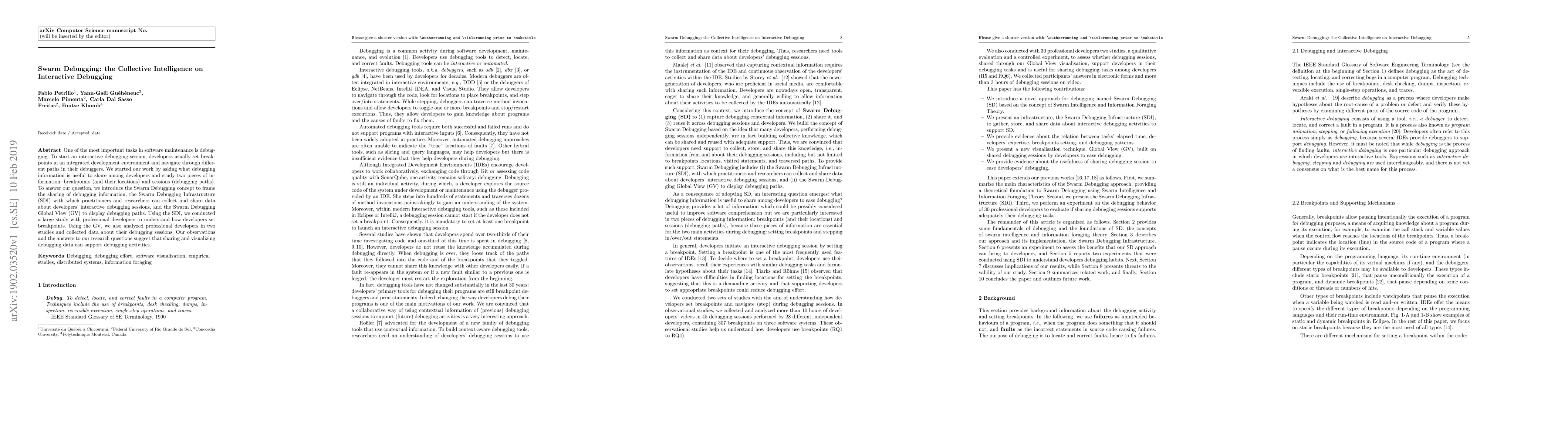 This paper introduces Swarm Debugging, a concept that facilitates the sharing of debugging information among developers. The Swarm Debugging Infrastructure (SDI) collects and shares data on breakpoints and debugging paths, while the Swarm Debugging Global View (GV) visualizes these paths, demonstrating that collective debugging intelligence can enhance debugging activities.