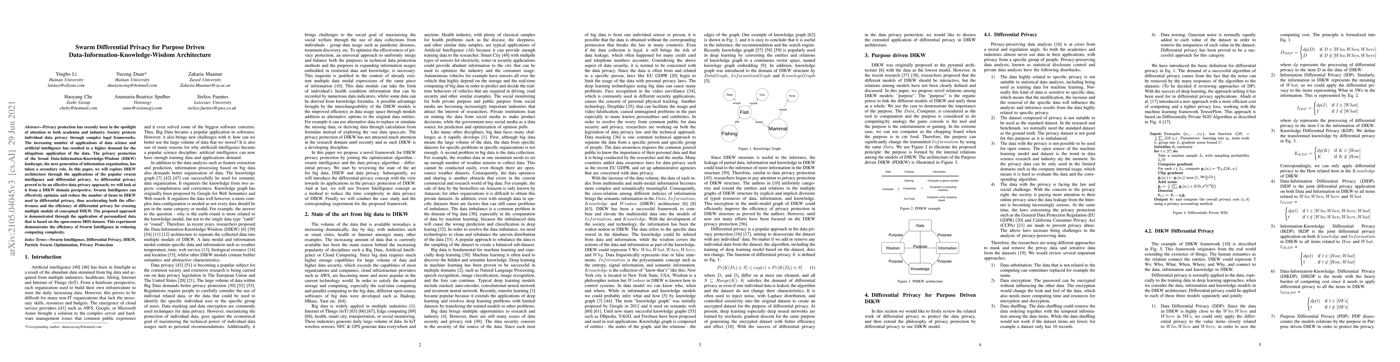 Privacy protection has recently been in the spotlight of attention to both academia and industry. Society protects individual data privacy through complex legal frameworks. The increasing number of applications of data science and artificial intelligence has resulted in a higher demand for the ubiquitous application of the data. The privacy protection of the broad Data-Information-Knowledge-Wisdom (DIKW) landscape, the next generation of information organization, has taken a secondary role. In this paper, we will explore DIKW architecture through the applications of the popular swarm intelligence and differential privacy. As differential privacy proved to be an effective data privacy approach, we will look at it from a DIKW domain perspective. Swarm Intelligence can effectively optimize and reduce the number of items in DIKW used in differential privacy, thus accelerating both the effectiveness and the efficiency of differential privacy for crossing multiple modals of conceptual DIKW. The proposed approach is demonstrated through the application of personalized data that is based on the open-sourse IRIS dataset. This experiment demonstrates the efficiency of Swarm Intelligence in reducing computing complexity.