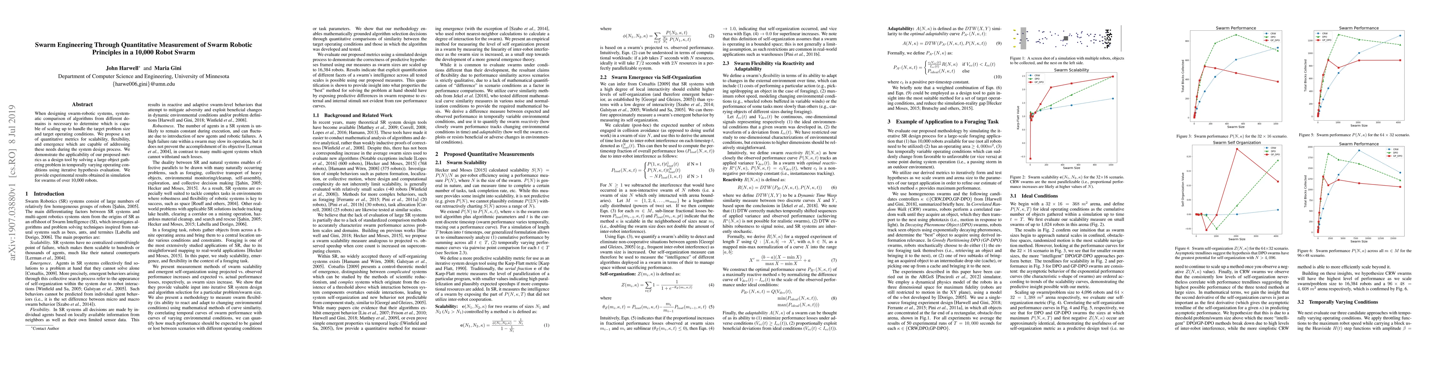 This paper proposes quantitative metrics for evaluating scalability, flexibility, and emergence in swarm-robotic systems, demonstrating their application through a large-scale object gathering problem simulation involving over 10,000 robots in varying conditions. The metrics serve as a design tool for algorithm comparison in swarm engineering.