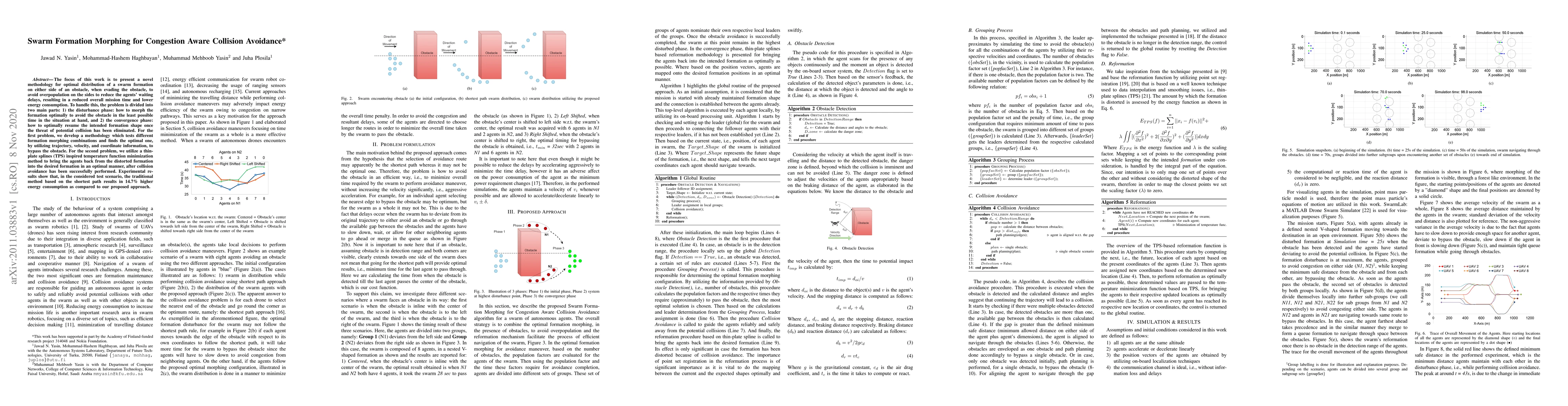 The focus of this work is to present a novel methodology for optimal distribution of a swarm formation on either side of an obstacle, when evading the obstacle, to avoid overpopulation on the sides to reduce the agents' waiting delays, resulting in a reduced overall mission time and lower energy consumption. To handle this, the problem is divided into two main parts: 1) the disturbance phase: how to morph the formation optimally to avoid the obstacle in the least possible time in the situation at hand, and 2) the convergence phase: how to optimally resume the intended formation shape once the threat of potential collision has been eliminated. For the first problem, we develop a methodology which tests different formation morphing combinations and finds the optimal one, by utilizing trajectory, velocity, and coordinate information, to bypass the obstacle. For the second problem, we utilize a thin-plate splines (TPS) inspired temperature function minimization method to bring the agents back from the distorted formation into the desired formation in an optimal manner, after collision avoidance has been successfully performed. Experimental results show that, in the considered test scenario, the traditional method based on the shortest path results in 14.7% higher energy consumption as compared to our proposed approach.