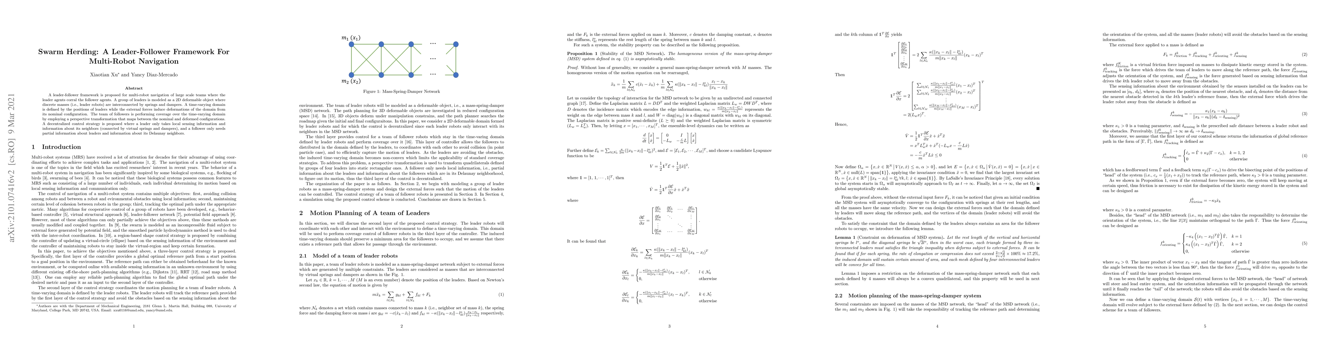 A leader-follower framework is proposed for multi-robot navigation of large scale teams where the leader agents corral the follower agents. A group of leaders is modeled as a 2D deformable object where discrete masses (i.e., leader robots) are interconnected by springs and dampers. A time-varying domain is defined by the positions of leaders while the external forces induce deformations of the domain from its nominal configuration. The team of followers is performing coverage over the time-varying domain by employing a perspective transformation that maps between the nominal and deformed configurations. A decentralized control strategy is proposed where a leader only takes local sensing information and information about its neighbors (connected by virtual springs and dampers), and a follower only needs partial information about leaders and information about its Delaunay neighbors.