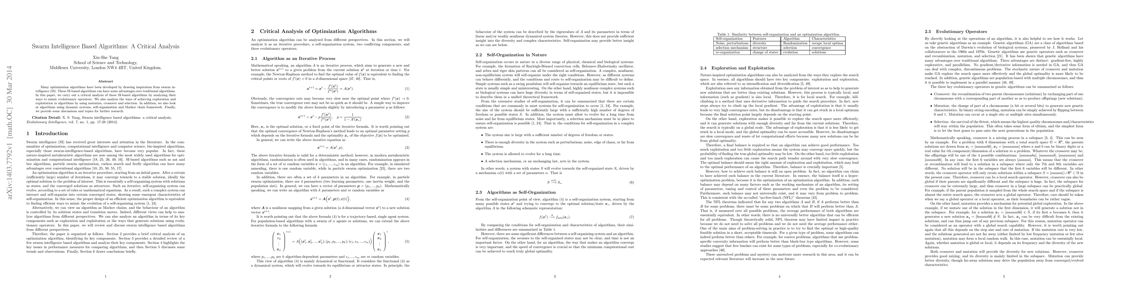 Many optimization algorithms have been developed by drawing inspiration from swarm intelligence (SI). These SI-based algorithms can have some advantages over traditional algorithms. In this paper, we carry out a critical analysis of these SI-based algorithms by analyzing their ways to mimic evolutionary operators. We also analyze the ways of achieving exploration and exploitation in algorithms by using mutation, crossover and selection. In addition, we also look at algorithms using dynamic systems, self-organization and Markov chain framework. Finally, we provide some discussions and topics for further research.