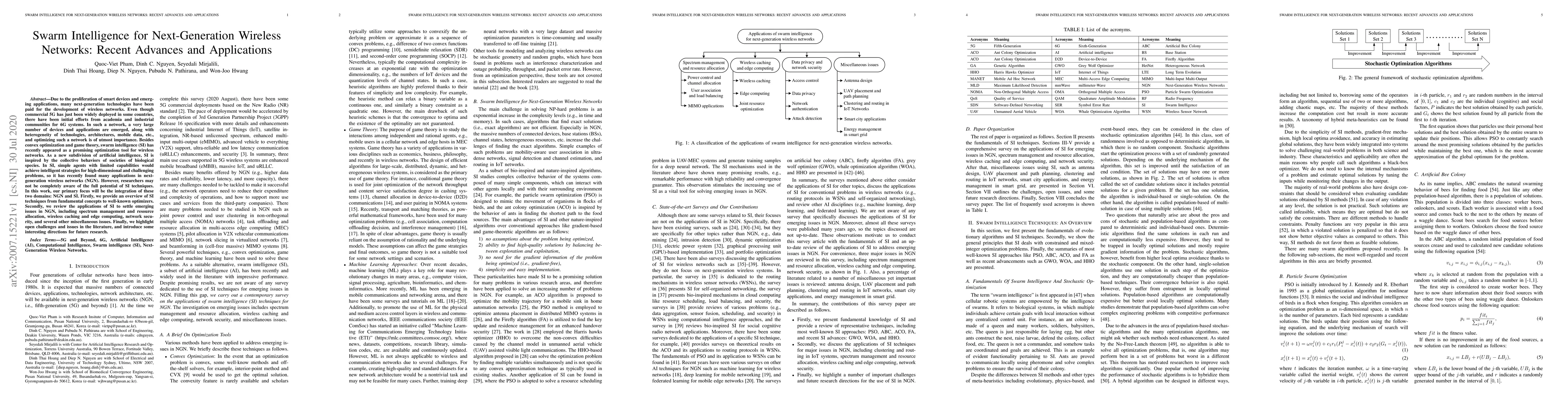 Due to the proliferation of smart devices and emerging applications, many next-generation technologies have been paid for the development of wireless networks. Even though commercial 5G has just been widely deployed in some countries, there have been initial efforts from academia and industrial communities for 6G systems. In such a network, a very large number of devices and applications are emerged, along with heterogeneity of technologies, architectures, mobile data, etc., and optimizing such a network is of utmost importance. Besides convex optimization and game theory, swarm intelligence (SI) has recently appeared as a promising optimization tool for wireless networks. As a new subdivision of artificial intelligence, SI is inspired by the collective behaviors of societies of biological species. In SI, simple agents with limited capabilities would achieve intelligent strategies for high-dimensional and challenging problems, so it has recently found many applications in next-generation wireless networks (NGN). However, researchers may not be completely aware of the full potential of SI techniques. In this work, our primary focus will be the integration of these two domains: NGN and SI. Firstly, we provide an overview of SI techniques from fundamental concepts to well-known optimizers. Secondly, we review the applications of SI to settle emerging issues in NGN, including spectrum management and resource allocation, wireless caching and edge computing, network security, and several other miscellaneous issues. Finally, we highlight open challenges and issues in the literature, and introduce some interesting directions for future research.