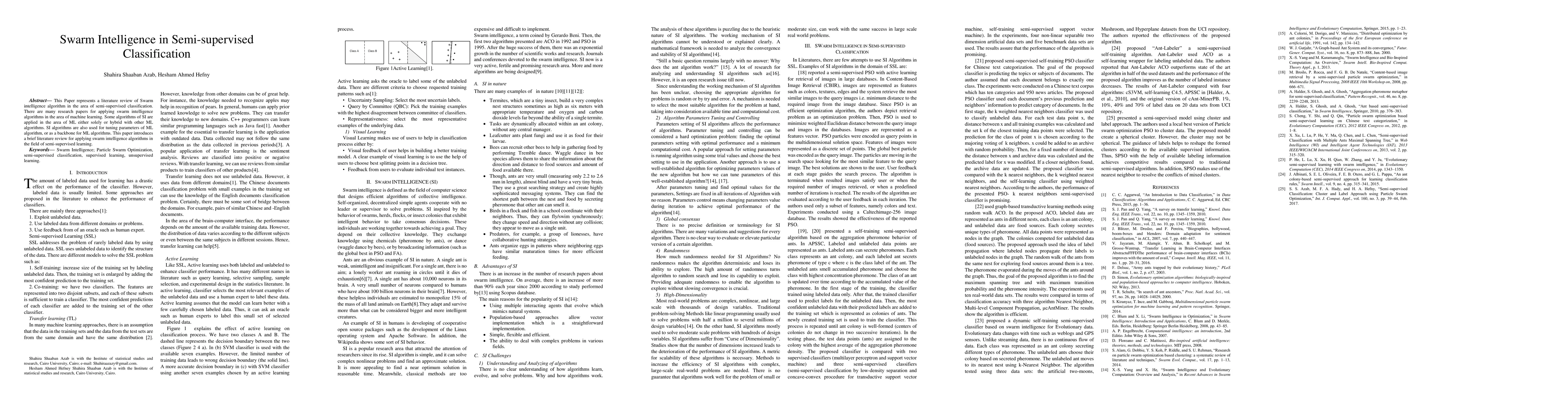 This paper provides a literature review on the application of swarm intelligence algorithms in semi-supervised classification, highlighting their use in machine learning either independently or in hybrid forms, and their role in parameter tuning and algorithm enhancement.