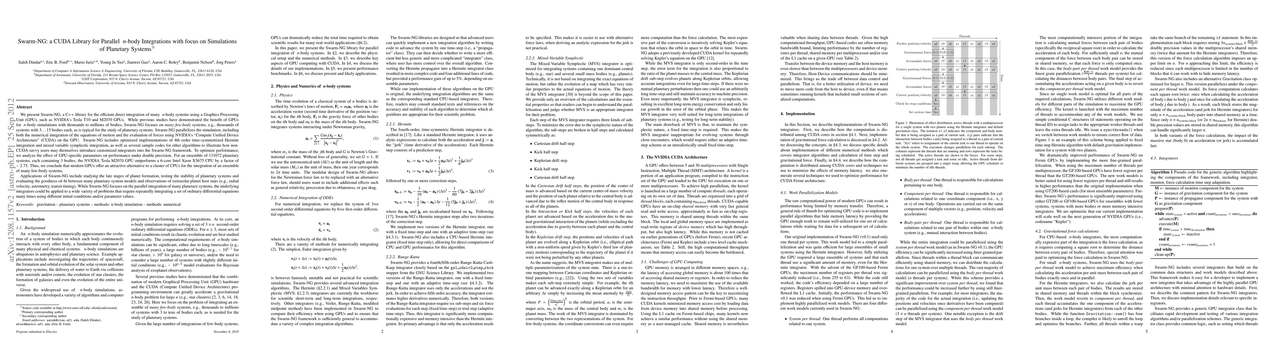 Swarm-NG is a C++ library for GPU-accelerated parallel n-body simulations, optimized for planetary systems with few bodies. It employs CUDA for efficient integration and force evaluation, supporting various symplectic integrators and customizable algorithms.