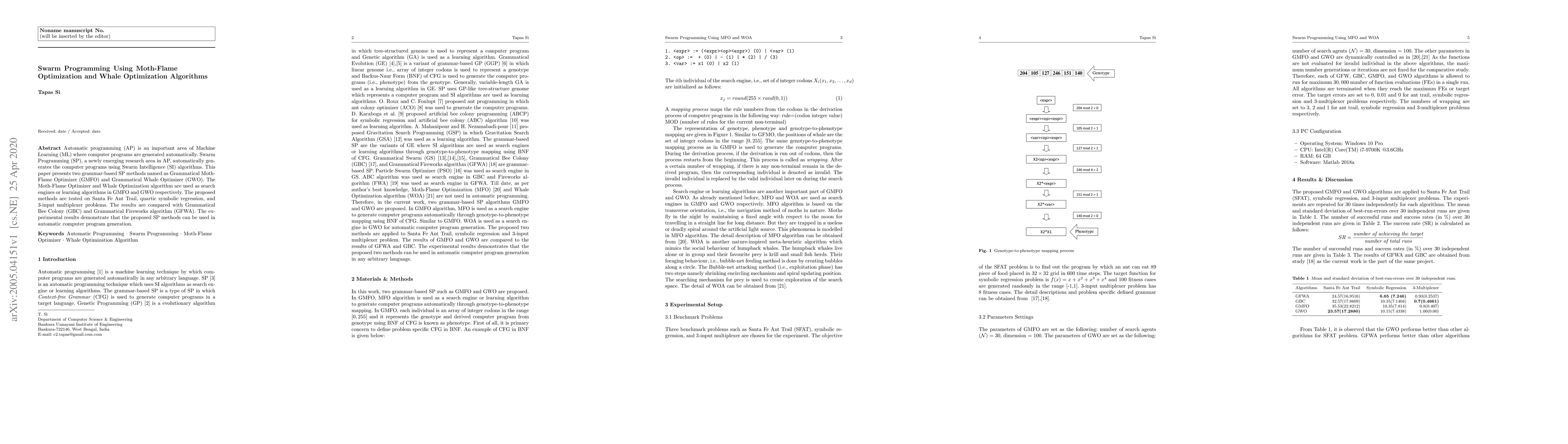 Automatic programming (AP) is an important area of Machine Learning (ML) where computer programs are generated automatically. Swarm Programming (SP), a newly emerging research area in AP, automatically generates the computer programs using Swarm Intelligence (SI) algorithms. This paper presents two grammar-based SP methods named as Grammatical Moth-Flame Optimizer (GMFO) and Grammatical Whale Optimizer (GWO). The Moth-Flame Optimizer and Whale Optimization algorithm are used as search engines or learning algorithms in GMFO and GWO respectively. The proposed methods are tested on Santa Fe Ant Trail, quartic symbolic regression, and 3-input multiplexer problems. The results are compared with Grammatical Bee Colony (GBC) and Grammatical Fireworks algorithm (GFWA). The experimental results demonstrate that the proposed SP methods can be used in automatic computer program generation.