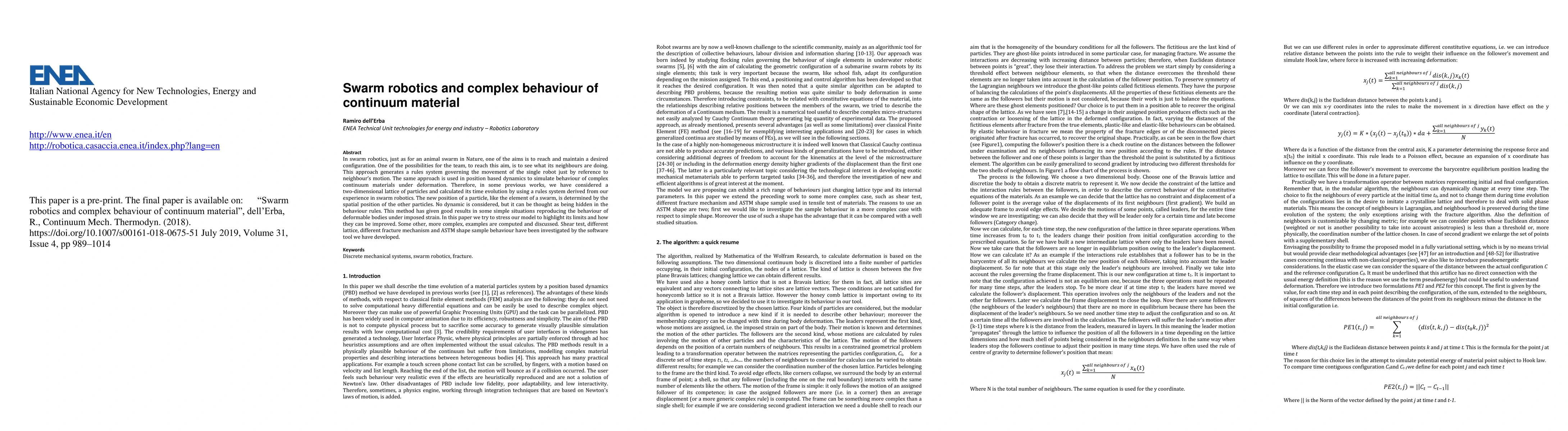 This paper explores the application of swarm robotics principles to simulate the complex behaviour of continuum materials under deformation, demonstrating the efficacy of a rules-based system derived from swarm dynamics. The authors evaluate the model's limitations and propose improvements by simulating more complex scenarios like shear tests and different fracture mechanisms.