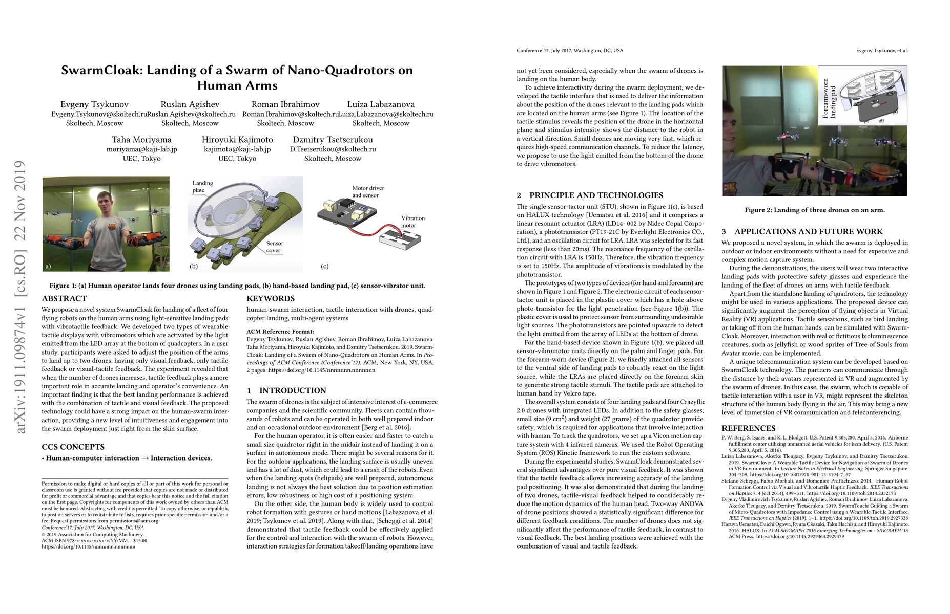 SwarmCloak enables a fleet of four nano-quadrotors to land on human arms using light-sensitive landing pads and vibrotactile feedback. Experiments show that tactile feedback significantly enhances landing accuracy and convenience, especially with more drones, with the best results achieved through combined tactile and visual feedback.