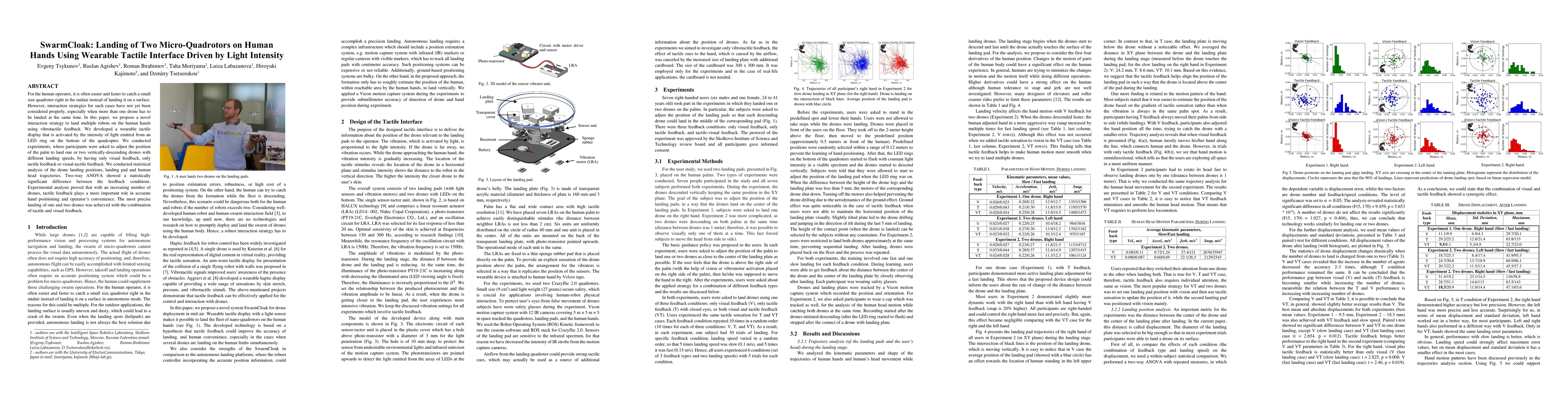 This paper proposes a novel interaction strategy using a wearable tactile display to land multiple micro-quadrotors on human hands, driven by light intensity feedback from the drones. Experiments show that tactile feedback significantly enhances landing accuracy, especially with more drones, and combined visual-tactile feedback yields the most precise landings.