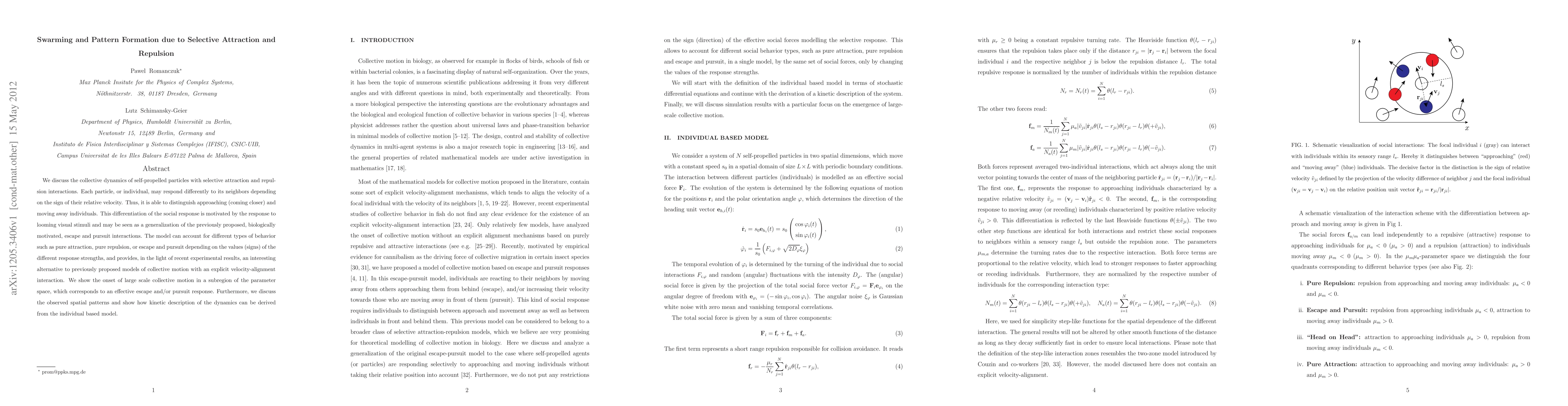 This paper explores the collective dynamics of self-propelled particles that exhibit selective attraction and repulsion based on relative velocity, leading to complex swarming behaviors and pattern formation. The model generalizes previous biological interaction models and provides an alternative to velocity-alignment based collective motion models.