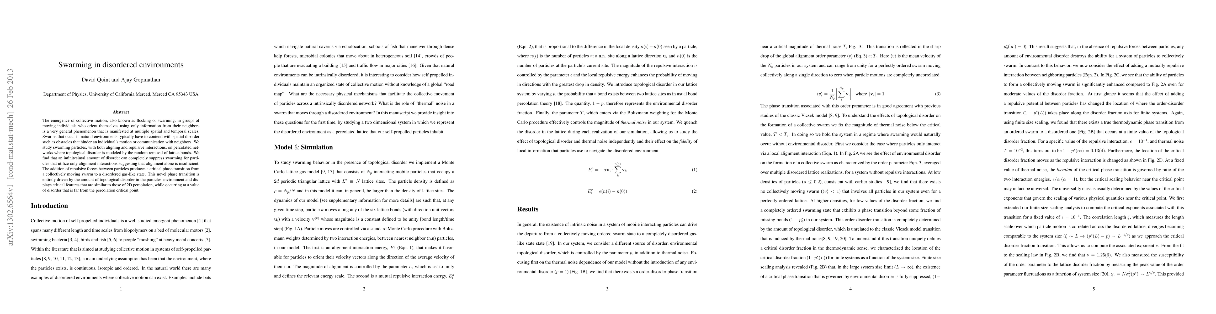 The research investigates swarming behavior in disordered environments using percolated networks. It reveals that alignment interactions alone can't sustain swarming with minimal disorder, while repulsive forces create a critical phase transition from collective motion to disordered state. This transition is unique, influenced by topological disorder, and resembles 2D percolation features at a disorder level distant from the percolation critical point.