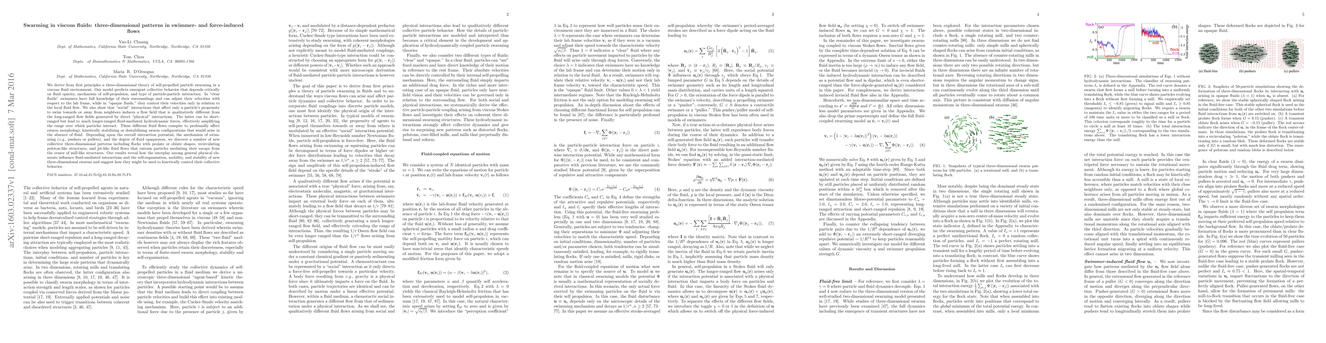This paper develops a three-dimensional theory for self-propelled particle swarming in viscous fluids, predicting emergent collective behaviors influenced by fluid opacity, self-propulsion mechanisms, and interaction types. It reveals how different fluid flows and interaction potentials influence swarm morphology, leading to new three-dimensional patterns such as flocks, pelotons, and jets.