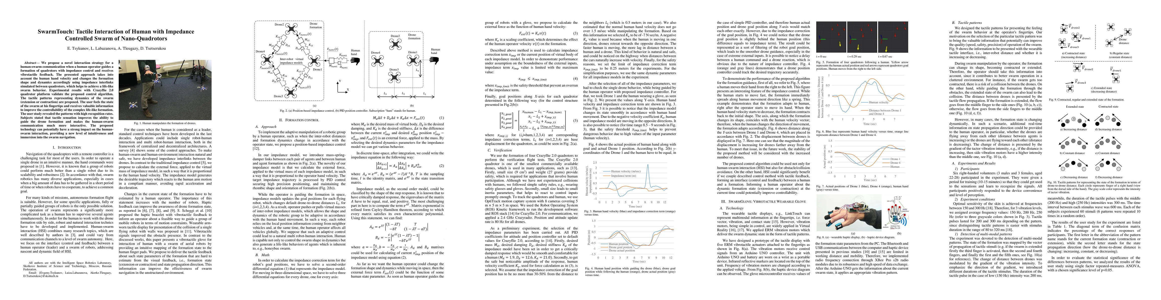 The paper introduces SwarmTouch, a novel method for human-swarm interaction using impedance control and vibrotactile feedback, enabling users to guide a formation of nano-quadrotors and feel the swarm's dynamics. The study shows high recognition rates for tactile patterns, enhancing control and interaction.