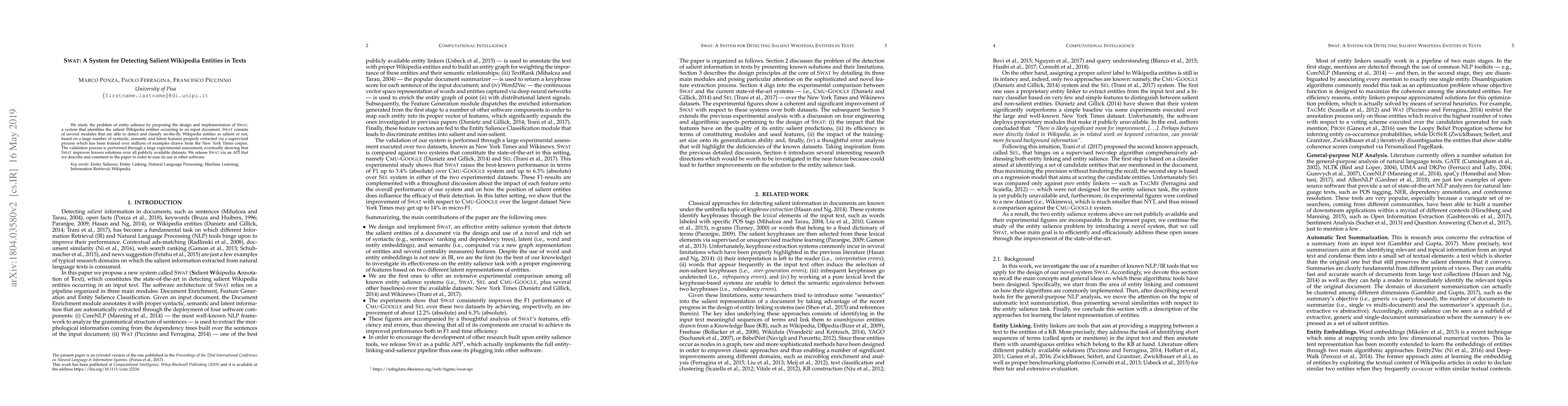 SWAT introduces a robust system for detecting salient Wikipedia entities in texts, leveraging a combination of syntactic, semantic, and latent features extracted via a supervised process trained on a large corpus.