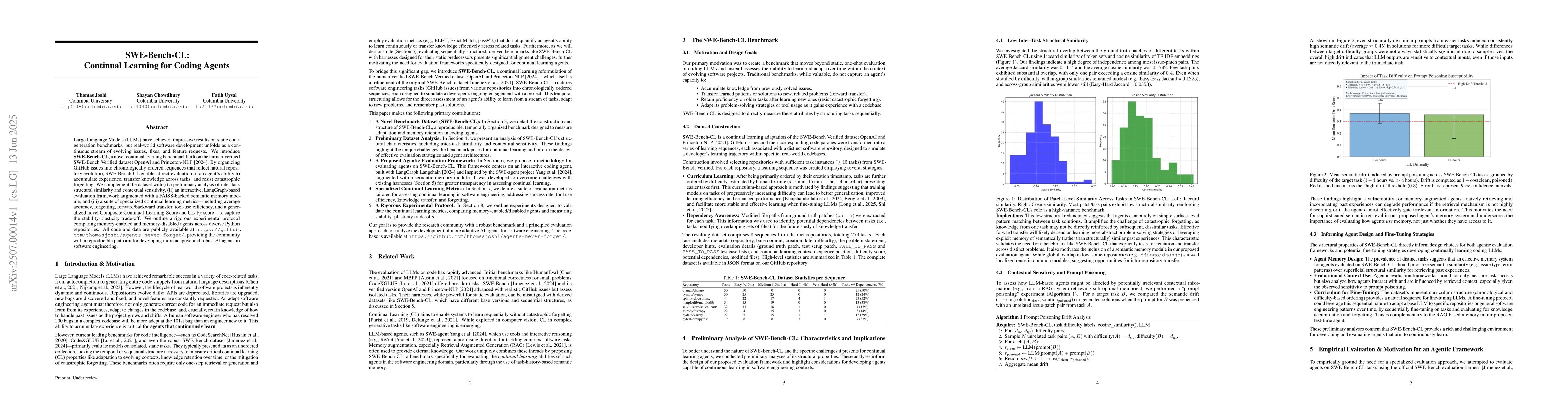 Large Language Models (LLMs) have achieved impressive results on static code-generation benchmarks, but real-world software development unfolds as a continuous stream of evolving issues, fixes, and feature requests. We introduce SWE-Bench-CL, a novel continual learning benchmark built on the human-verified SWE-Bench Verified dataset introduced by OpenAI and Princeton-NLP in 2024. By organizing GitHub issues into chronologically ordered sequences that reflect natural repository evolution, SWE-Bench-CL enables direct evaluation of an agent's ability to accumulate experience, transfer knowledge across tasks, and resist catastrophic forgetting. We complement the dataset with (i) a preliminary analysis of inter-task structural similarity and contextual sensitivity, (ii) an interactive LangGraph-based evaluation framework augmented with a FAISS-backed semantic memory module, and (iii) a suite of specialized continual learning metrics -- including average accuracy, forgetting, forward/backward transfer, tool-use efficiency, and a generalized Composite Continual Learning Score and CL-F-beta score -- to capture the stability-plasticity trade-off. We outline a rigorous experimental protocol comparing memory-enabled and memory-disabled agents across diverse Python repositories. All code and data are publicly available at https://github.com/thomasjoshi/agents-never-forget, providing the community with a reproducible platform for developing more adaptive and robust AI agents in software engineering.