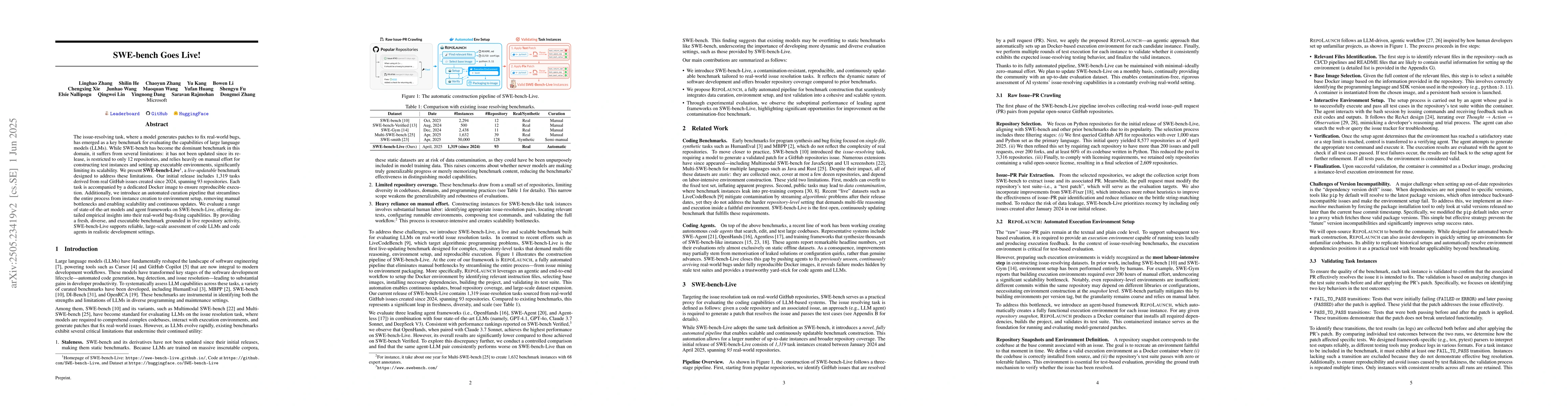 SWE-bench-Live provides a fresh, diverse, and executable benchmark grounded in live repository activity, facilitating rigorous, contamination-resistant evaluation of LLMs and agents in real-world software development settings.