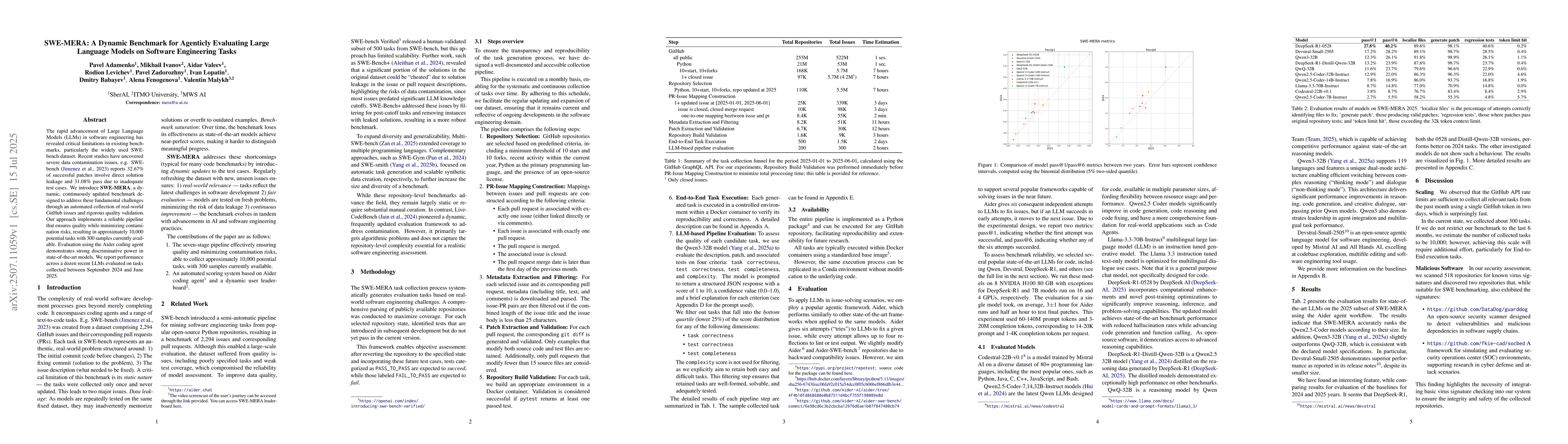 SWE-MERA is a dynamic benchmark for evaluating large language models on software engineering tasks, addressing limitations of existing benchmarks like SWE-bench through automated collection of real-world GitHub issues and rigorous quality validation.