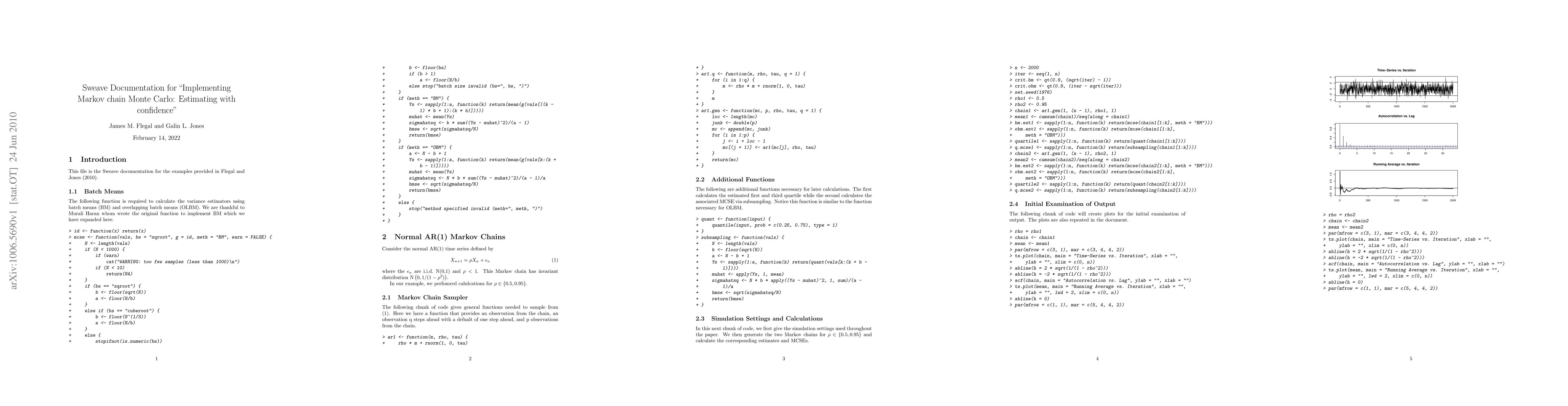 This document provides Sweave code for examples in the chapter "Implementing Markov chain Monte Carlo: Estimating with confidence" by Flegal and Jones, which details practical applications of Markov chain Monte Carlo methods in statistical estimation. The chapter is part of the Handbook of Markov Chain Monte Carlo edited by Brooks et al.