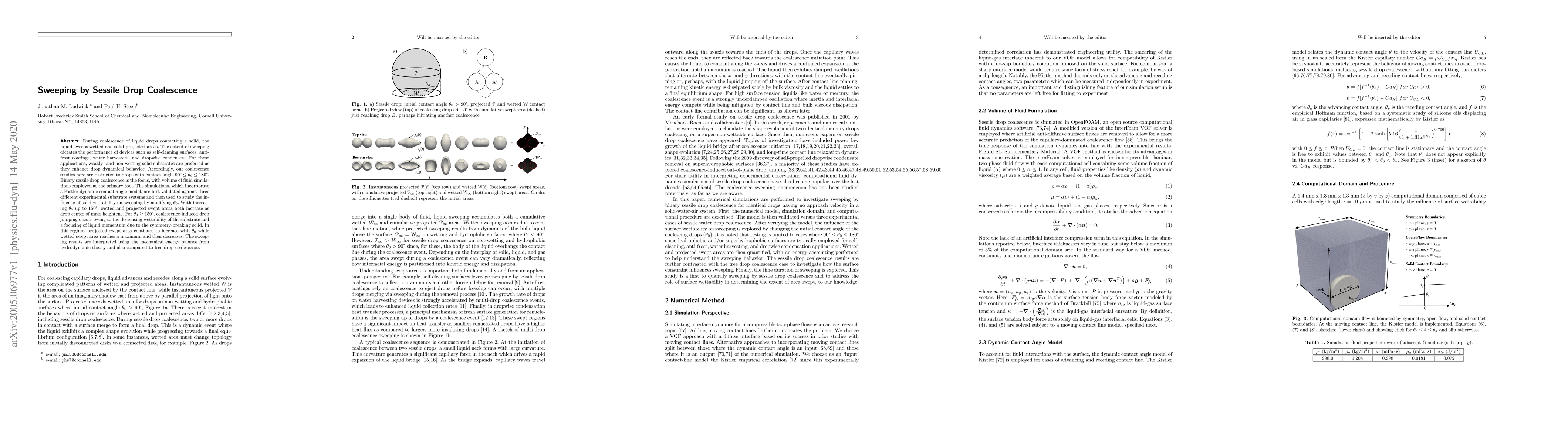 The paper presents a validated computational model for simulating sessile drop coalescence, incorporating a Kistler dynamic contact angle model, and provides insights into the influence of surface wettability on sweeping behavior.