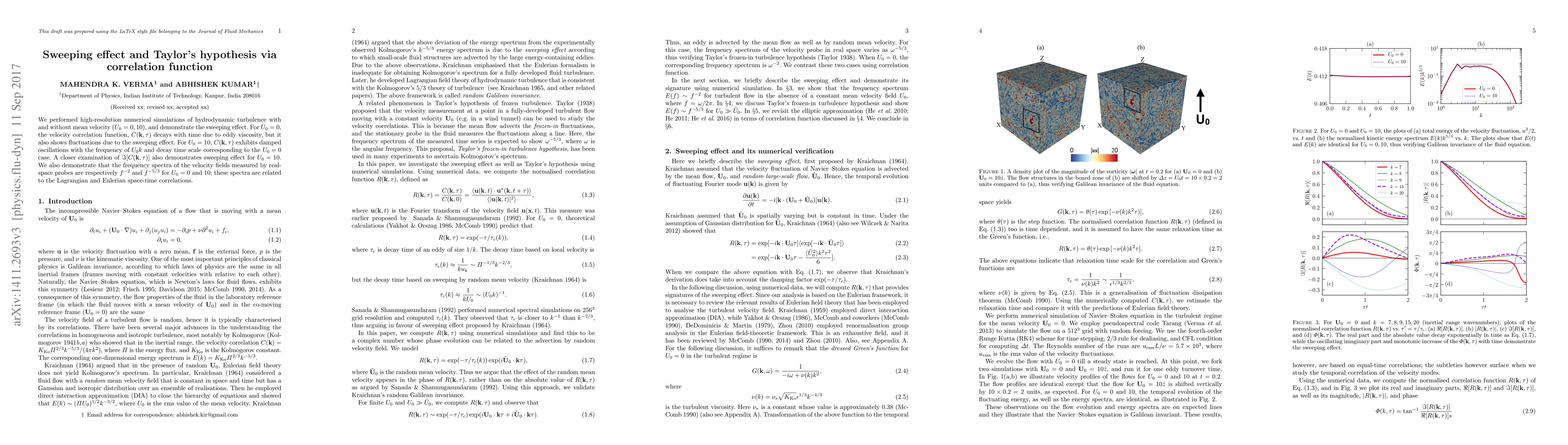 We performed high-resolution numerical simulations of hydrodynamic turbulence with and without mean velocity ($U_0=0,10$), and demonstrate the sweeping effect. For $U_0=0$, the velocity correlation function, $C({\bf k},\tau)$ decays with time due to eddy viscosity, but it also shows fluctuations due to the sweeping effect. For $U_0=10$, $C({\bf k},\tau)$ exhibits damped oscillations with the frequency of $U_0 k$ and decay time scale corresponding to the $U_0=0$ case. A closer examination of $\Im[C({\bf k},\tau)]$ also demonstrates sweeping effect for $U_0=10$. We also demonstrate that the frequency spectra of the velocity fields measured by real-space probes are respectively $f^{-2}$ and $f^{-5/3}$ for $U_0=0$ and 10; these spectra are related to the Lagrangian and Eulerian space-time correlations.