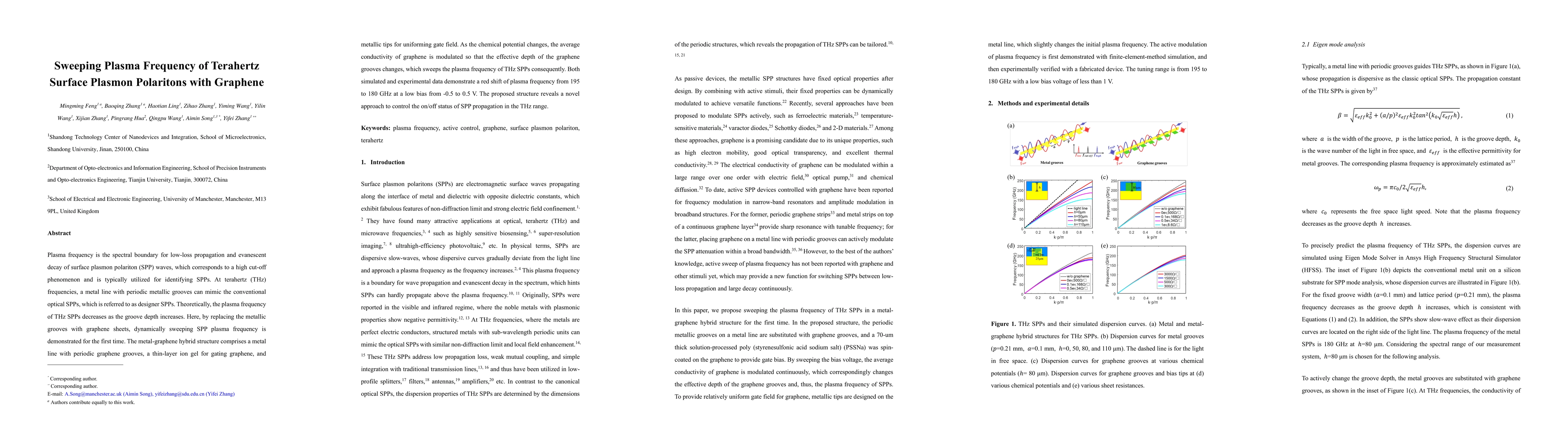 Plasma frequency is the spectral boundary for low-loss propagation and evanescent decay of surface plasmon polariton (SPP) waves, which corresponds to a high cut-off phenomenon and is typically utilized for identifying SPPs. At terahertz (THz) frequencies, a metal line with periodic metallic grooves can mimic the conventional optical SPPs, which is referred to as designer SPPs. Theoretically, the plasma frequency of THz SPPs decreases as the groove depth increases. Here, by replacing the metallic grooves with graphene sheets, dynamically sweeping SPP plasma frequency is demonstrated for the first time. The metal-graphene hybrid structure comprises a metal line with periodic graphene grooves, a thin-layer ion gel for gating graphene, and metallic tips for uniforming gate field. As the chemical potential changes, the average conductivity of graphene is modulated so that the effective depth of the graphene grooves changes, which sweeps the plasma frequency of THz SPPs consequently. Both simulated and experimental data demonstrate a red shift of plasma frequency from 195 to 180 GHz at a low bias from -0.5 to 0.5 V. The proposed structure reveals a novel approach to control the on/off status of SPP propagation in the THz range.