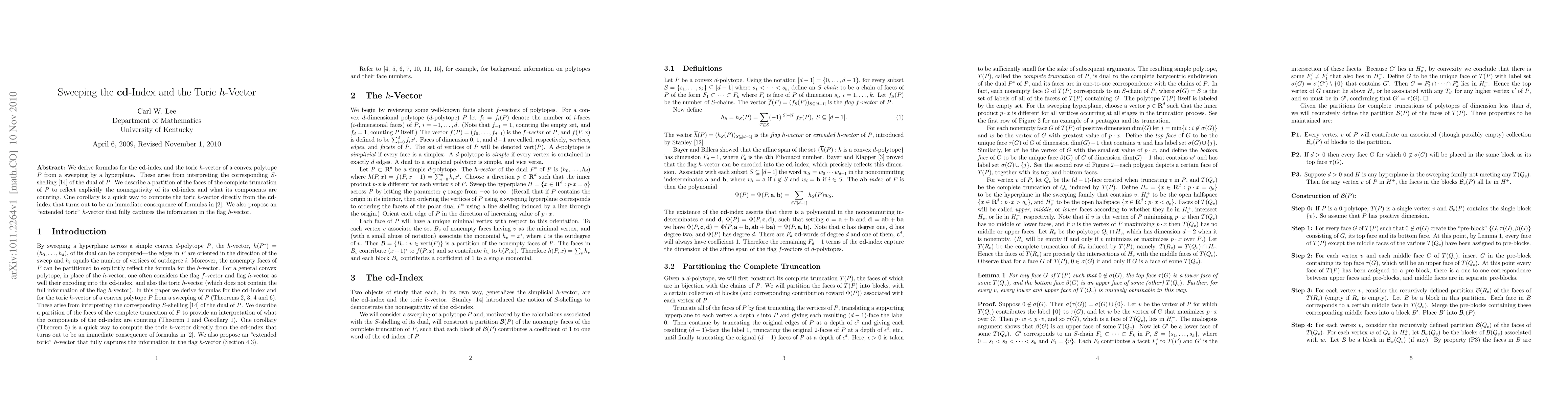 We derive formulas for the cd-index and the toric h-vector of a convex polytope P from a sweeping by a hyperplane. These arise from interpreting the corresponding S-shelling of the dual of P. We describe a partition of the faces of the complete truncation of P to reflect explicitly the nonnegativity of its cd-index and what its components are counting. One corollary is a quick way to compute the toric h-vector directly from the cd-index. We also propose an "extended toric" h-vector that fully captures the information in the flag h-vector.