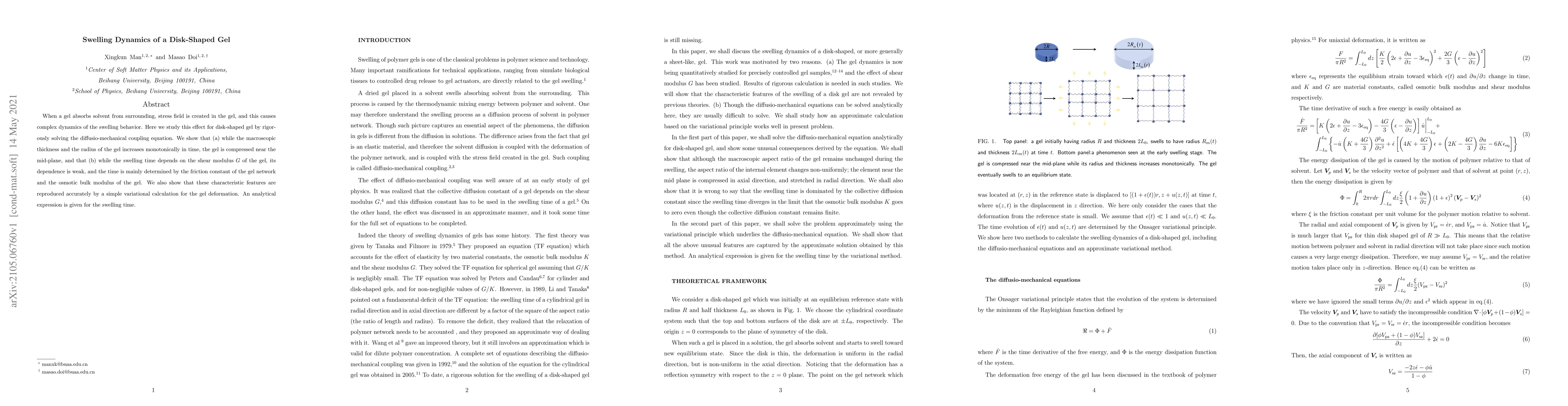 When a gel absorbs solvent from surrounding, stress field is created in the gel, and this causes complex dynamics of the swelling behavior. Here we study this effect for disk-shaped gel by rigorously solving the diffusio-mechanical coupling equation. We show that (a) while the macroscopic thickness and the radius of the gel increases monotonically in time, the gel is compressed near the mid-plane, and that (b) while the swelling time depends on the shear modulus $G$ of the gel, its dependence is weak, and the time is mainly determined by the friction constant of the gel network and the osmotic bulk modulus of the gel. We also show that these characteristic features are reproduced accurately by a simple variational calculation for the gel deformation. An analytical expression is given for the swelling time.
