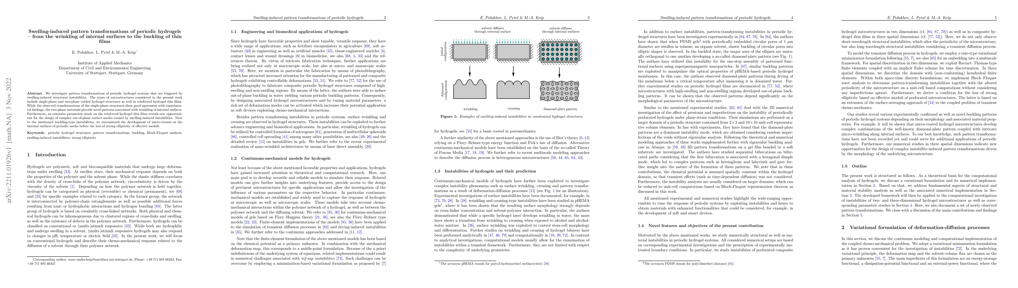 This paper examines how swelling-induced structural instabilities transform patterns in periodic hydrogel systems, including wrinkling in internal surfaces and buckling in thin films, with reinforced structures showing new design possibilities for complex surface modes. Experimental observations align well with single-phase transformations, while two-phase materials reveal novel internal surface wrinkling patterns.