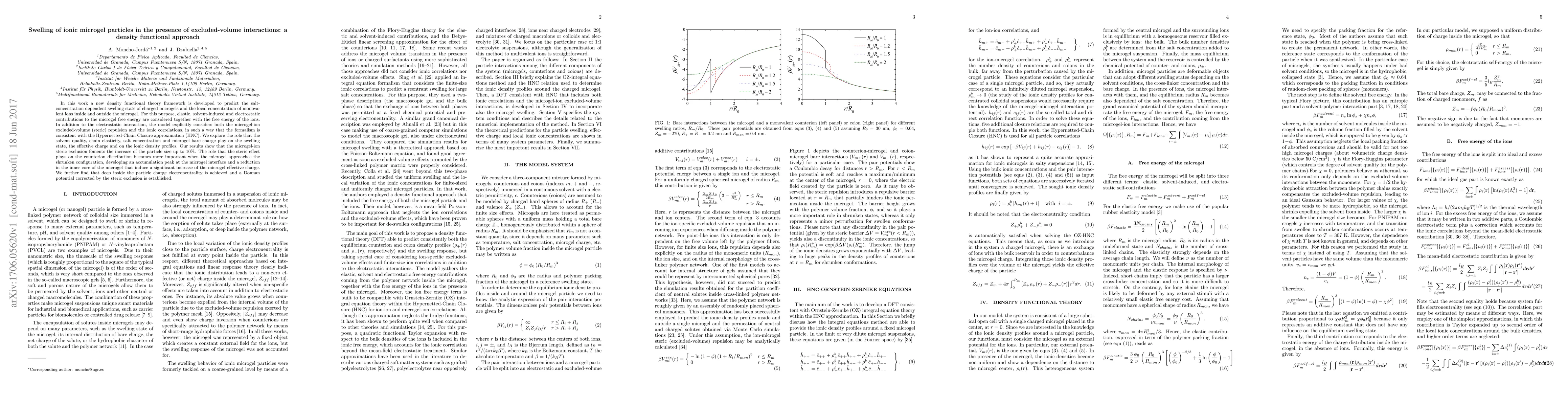 In this work a new density functional theory framework is developed to predict the salt-concentration dependent swelling state of charged microgels and the local concentration of monovalent ions inside and outside the microgel. For this purpose, elastic, solvent-induced and electrostatic contributions to the microgel free energy are considered together with the free energy of the ions. In addition to the electrostatic interaction, the model explicitly considers both the microgel-ion excluded-volume (steric) repulsion and the ionic correlations, in such a way that the formalism is consistent with the Hypernetted-Chain Closure approximation (HNC). We explore the role that the solvent quality, chain elasticity, salt concentration and microgel bare charge play on the swelling state, the effective charge and on the ionic density profiles. Our results show that the microgel-ion steric exclusion foments the increase of the particle size up to 10 %. The role that the steric effect plays on the counterion distribution becomes more important when the microgel approaches the shrunken configuration, developing an accumulation peak at the microgel interface and a reduction in the inner core of the microgel that induce a significant increase of the microgel effective charge. We further find that deep inside the particle charge electroneutrality is achieved and a Donnan potential corrected by the steric exclusion is established.