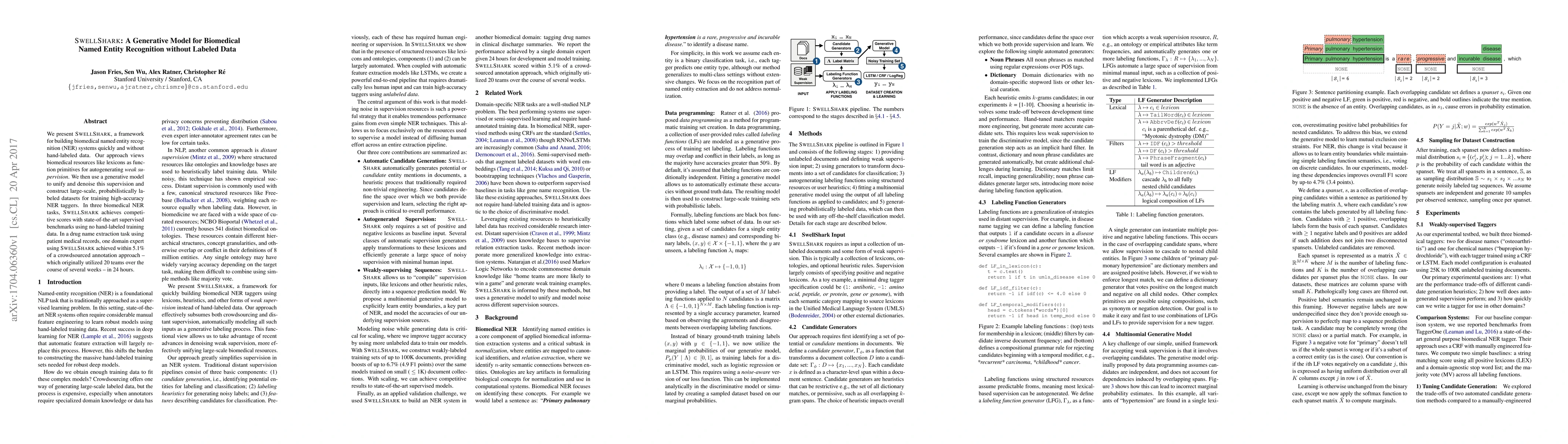 SwellShark is a generative model for biomedical named entity recognition (NER) that operates without labeled data, leveraging autogenerated weak supervision from biomedical resources. It achieves competitive performance in NER tasks compared to supervised methods, demonstrating effectiveness in drug name extraction from medical records.