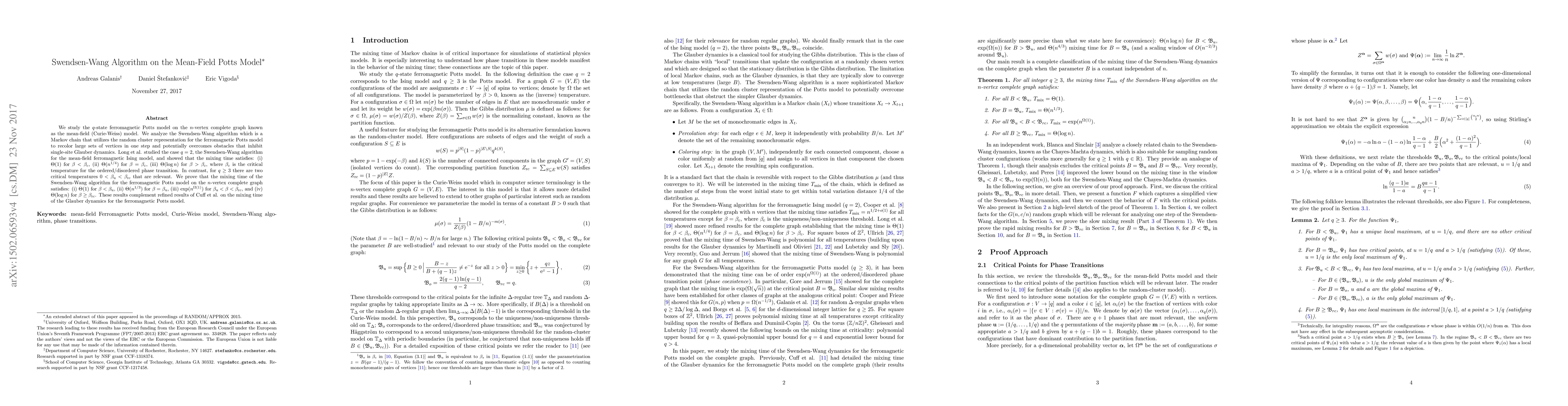 This paper analyzes the Swendsen-Wang algorithm for the $q$-state ferromagnetic Potts model on a complete graph, showing its mixing time behavior for different temperature regimes. It finds that the algorithm's mixing time is $\Theta(1)$ for temperatures below a critical value $\beta_u$, $\Theta(n^{1/3})$ at $\beta_u$, $\exp(n^{\Omega(1)})$ between $\beta_u$ and another critical temperature $\beta_{rc}$, and $\Theta(\log{n})$ for $\beta \geq \beta_{rc}$.