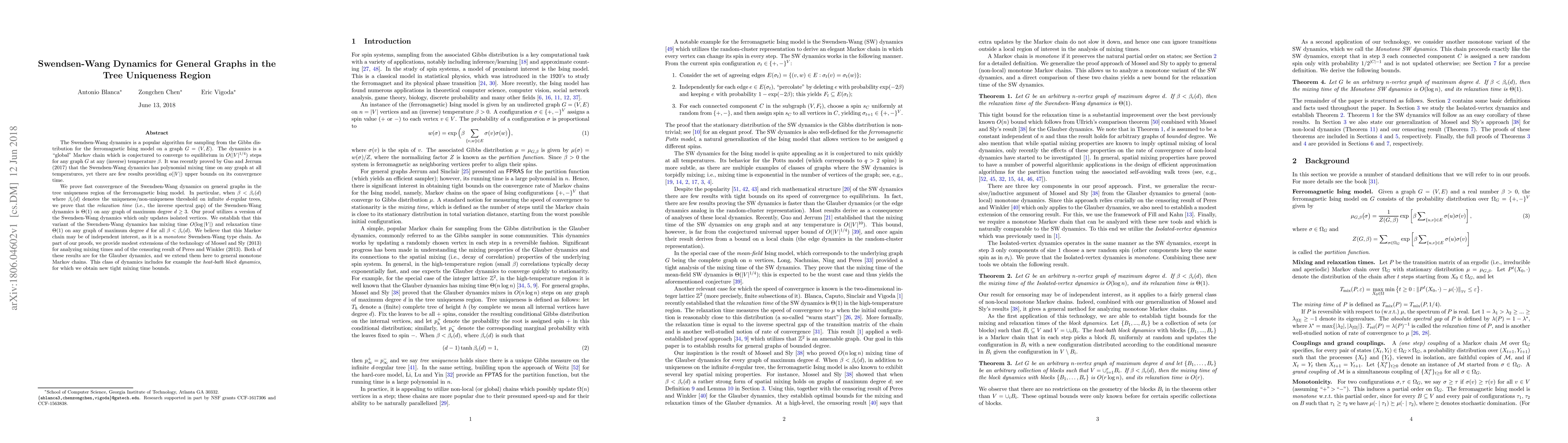 This paper proves fast convergence of the Swendsen-Wang dynamics for the ferromagnetic Ising model on general graphs in the tree uniqueness region, showing that the relaxation time is $\Theta(1)$ when $\beta < \beta_c(d)$. The authors introduce a variant of the dynamics that updates only isolated vertices, achieving a mixing time of $O(\log{|V|})$ and a relaxation time of $\Theta(1)$ for graphs of maximum degree $d$.