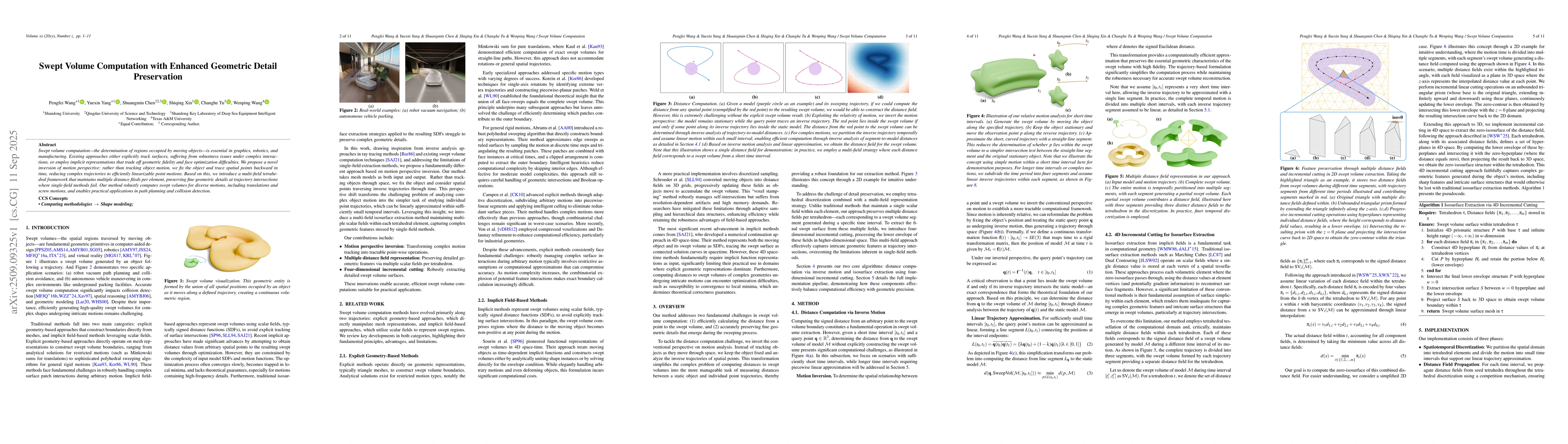 Swept volume computation, the determination of regions occupied by moving objects, is essential in graphics, robotics, and manufacturing. Existing approaches either explicitly track surfaces, suffering from robustness issues under complex interactions, or employ implicit representations that trade off geometric fidelity and face optimization difficulties. We propose a novel inversion of motion perspective: rather than tracking object motion, we fix the object and trace spatial points backward in time, reducing complex trajectories to efficiently linearizable point motions. Based on this, we introduce a multi field tetrahedral framework that maintains multiple distance fileds per element, preserving fine geometric details at trajectory intersections where single field methods fail. Our method robustly computes swept volumes for diverse motions, including translations and screw motions, and enables practical applications in path planning and collision detection.