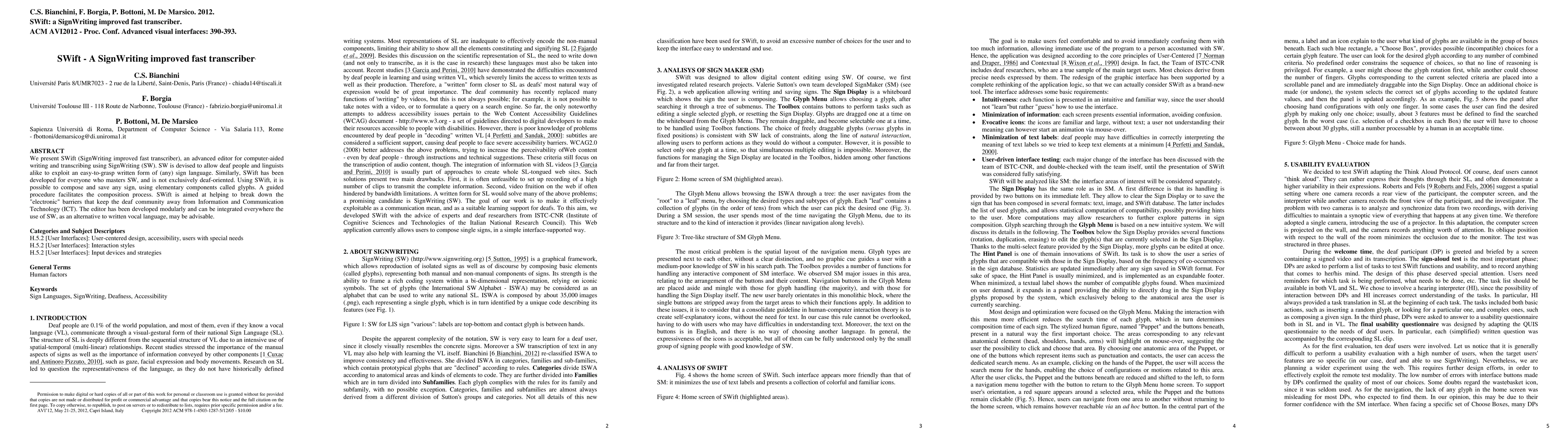 We present SWift (SignWriting improved fast transcriber), an advanced editor for computer-aided writing and transcribing using SignWriting (SW). SW is devised to allow deaf people and linguists alike to exploit an easy-to-grasp written form of (any) sign language. Similarly, SWift has been developed for everyone who masters SW, and is not exclusively deaf-oriented. Using SWift, it is possible to compose and save any sign, using elementary components called glyphs. A guided procedure facilitates the composition process. SWift is aimed at helping to break down the "electronic" barriers that keep the deaf community away from Information and Communication Technology (ICT). The editor has been developed modularly and can be integrated everywhere the use of SW, as an alternative to written vocal language, may be advisable.