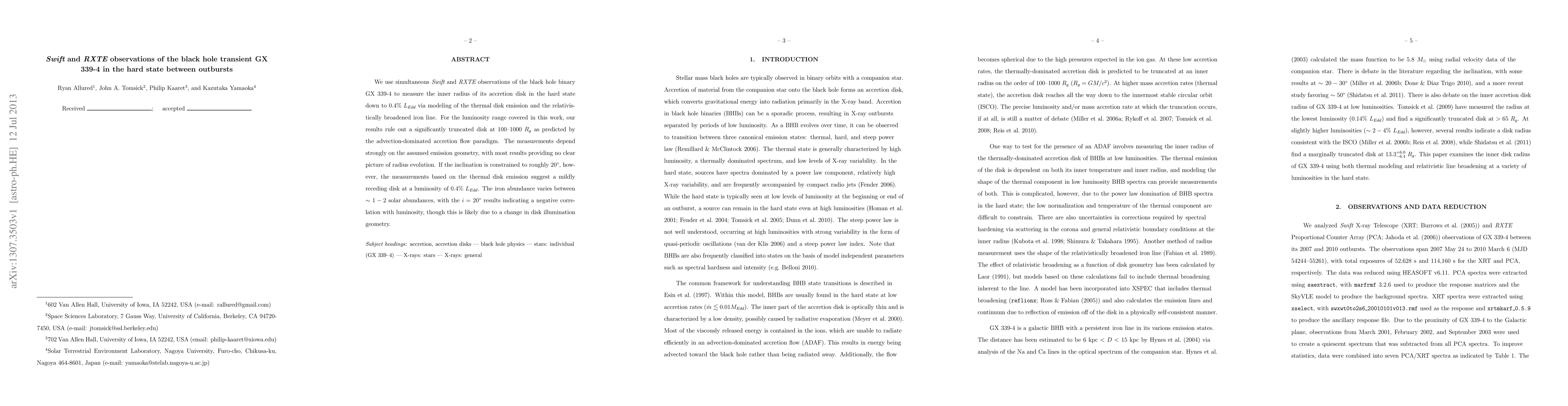 The study uses Swift and RXTE observations of black hole binary GX 339-4 in the hard state to measure disk inner radius. Results, dependent on emission geometry assumptions, suggest no significant disk truncation down to 0.4% of Eddington luminosity, contradicting advection-dominated accretion flow models. With constrained inclination of 20 degrees, the thermal disk emission implies a mildly receding disk. Iron abundance varies between 1-2 solar values, correlating negatively with luminosity due to disk illumination geometry changes.