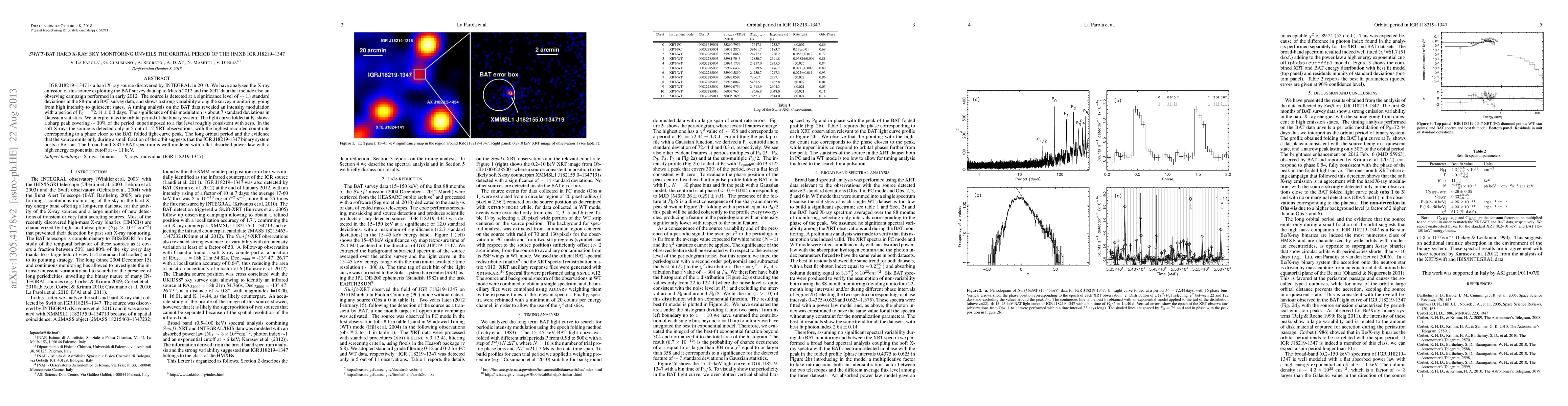 The Swift-BAT survey identified a hard X-ray source, IGR J18219-1347, with a strong variability and an orbital period of 72.46 days, interpreted as the binary system's orbital period. The source exhibits significant emission only during a small fraction of its orbit, suggesting it is a Be star system.