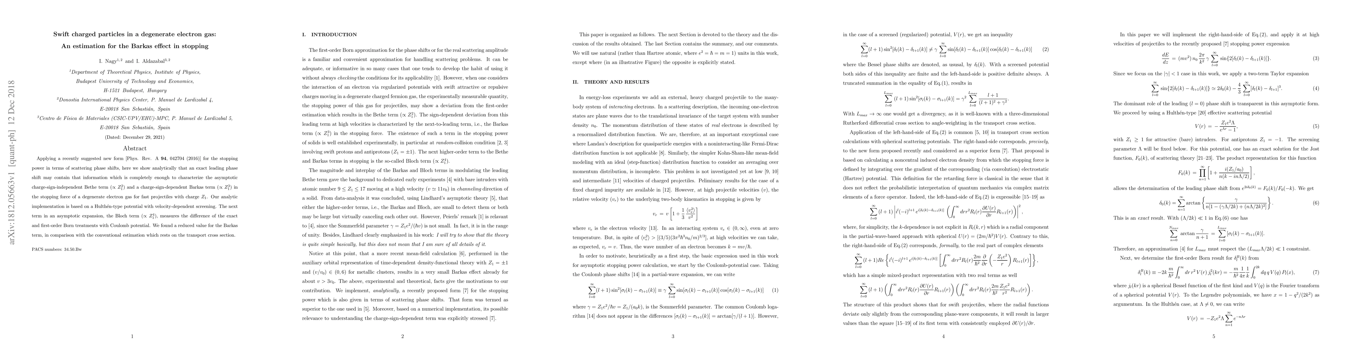 This paper estimates the Barkas effect in stopping fast charged particles in a degenerate electron gas using a new analytical approach based on scattering phase shifts. The study finds a reduced value for the Barkas term compared to conventional estimations, highlighting the importance of exact leading phase shifts in characterizing stopping forces.