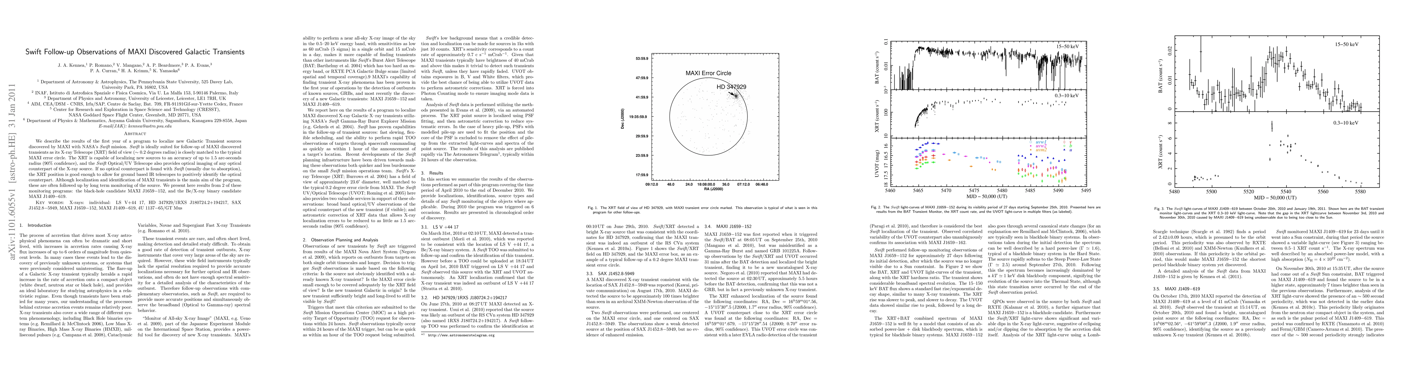 This paper reports on the first year of a program using NASA's Swift mission to localize new Galactic transient sources discovered by MAXI, achieving precise X-ray source localization and optical/UV imaging. It presents follow-up monitoring results for the black-hole candidate MAXI J1659-152 and the Be/X-ray binary candidate MAXI J1409-619.